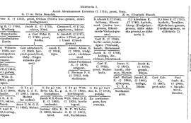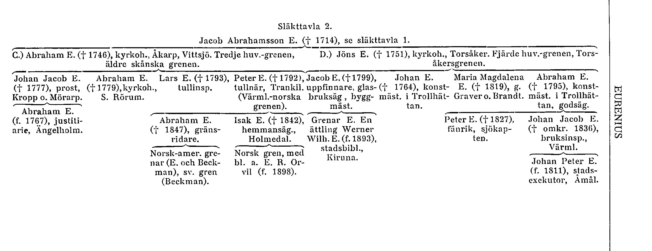 C. Tredje huvudgrenen (äldre Skånegrenen med värmländsk-norska grenen). I sitt tredje gifte hade Noraprosten Jacob A. E. (ovan s. 678) – utom tullinspektören Jacob E. (ovan s. 681) – även sonen Abraham E. (f. 1681, d. 1746), som först studerade i Uppsala. Efter branden där 1702 överflyttade han studierna till Lund, där hans faders svåger (från första giftet) M. Steuchius då var biskop. A. E. blev magister där 1706 samt kyrkoherde i Åkarp och Vittsjö (Krist.) 1711. Han gifte in sig i den skånska släkten Feuk. Av hans fem söner (endast två kända för Örnberg) blevo tvenne också präster, nämligen magister Johan Jacob E. (f. 1713, d. 1777), kyrkoherde i Kropp och Mörarp (Malm.) samt kontraktsprost, och Abraham E. (f. 1719, d. barnlös 1779), kyrkoherde i Södra Rörum (Malm.). Av deras bröder blev Lars E. (f. 1721, t 1793) tullinspektor i Kristianstad, medan Isac E. (f. 1720, d. ogift 1742) blev kontorsskrivare i Kristianstads landskontor. Av prosten J. J. E:s (f 1777) barn var Abraham E. (f. 1767, d. utrikes) justitiarie i Ängelholm 1793–95, men fick på egen begäran avsked och for utomlands (Enghoff, s. 151; Sjöström); två hans bröder avledo ogifta.