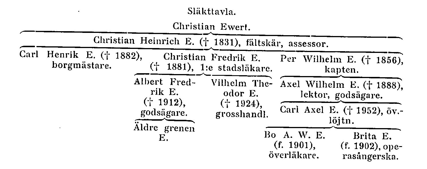 Ewert, ursprungligen pommersk släkt, härstammar från borgaren i Stralsund Christian Ewert. Dennes son Christian Heinrich E. (f. 3 april 1759 i Stralsund, d. 10 maj 1831 i Göteborg) kom vid nitton års ålder till Stockholm och studerade till fältskär. Han blev ordinarie underläkare vid Amiralitetet i Karlskrona 1782 och var kirurg på divisionsskeppet Prins Gustaf i slaget vid Hogland 1788, där han blev fången; han kvarhölls av ryssarna till krigets slut. Han blev 1793 kirurgie magister och flyttade senare till Göteborg, var regementsfältskär vid Göta artillerireg:te 7 okt. 1795–1810, andre läkare vid Sahlgrenska sjukhuset samt erhöll assessors titel; LVVS 1810. Assessor E. blev nära vän till de kända Göteborgsläkarna P. Dubb (SBL, 11, s. 478 ff.) och Chr. Carlander (SBL, 7, s. 317 ff.). Tillsammans stiftade de en »societet», som dock mera var en umgängeskrets än en organiserad förening, vanligen kallad »Den Carlanderska societeten»; den blev emellertid en betydelsefull föregångare till Göteborgs läkaresällskap. I sitt andra gifte äktade C. H. E. köpmansdottern Christina Elisabeth Malm, syster till grosshandlaren, tit. kommerserådet och riksdagsmannen J. N. Malm. De hade söner, som blevo bemärkta göteborgare. Den äldste, Carl Henrik E. (f. 27 sept. 1802 i Göteborg, d. 2 okt. 1882 där), var rådman i staden 1835–45 samt handels- och politiborgmästare där 1845–67. Som borgmästare var G. H. E. synnerligen myndig, men samtidigt kunnig, klar och redig, rättrådig och oegennyttig samt med starkt utpräglat ordningssinne (Ambrosiani). Han var livligt kommunalt verksam (kommittéuppdrag angivna i »The Royal Bachelor's Club») och satt även i representationskommittén 1846–47, där han räknades till de mot kungen lojala medlemmarna. C. H. E.. hade i sina äktenskap ingen son.