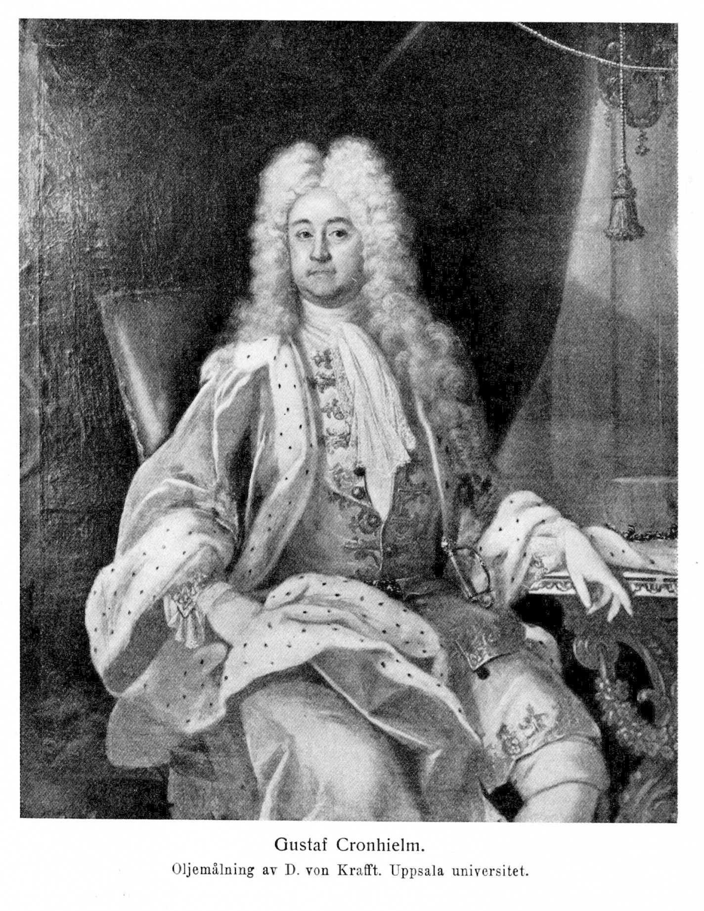 2. Gustaf Cronhielm, den föregåendes son, f. 18 juli 1664 i Stockholm, d. 3 juni 1737 därstädes. Greve till Flosta i Altuna socken, friherre till Segloraberg i Seglora socken, herre till Hyltenäs i Örby socken, Krantsbo i Istorps socken samt Styrsta i Lännäs socken. Student i Uppsala 26 sept. 1677; auskultant i riksarkivet 29 juli 1682; företog utländska resor 1684—87, delvis med understöd av konungen; kammarjunkare vid württembergska hovet 1686—87 (instruktion 20 okt. 1686); hovjunkare hos Karl XI 1687; kammarherre hos kronprinsen från årsskiftet 1688—89; biträdde vid dennes undervisning från 1695; bevistade riksdagen 1697 och utskottsmötet 1710 och var därunder bl. a. ledamot av sekreta utskottet och bankoutskottet 1697 och 1710 samt v. lantmarskalk 1710; landshövding i Västmanlands län 15 apr. 1698; hovkansler 21 mars 1710; K. råd, kansliråd och ordförande i lagkommissionen 30 aug. 1710 (vilket blev känt i Stockholm i mars 1711); fungerade efter val 6 sept. 1710 som Uppsala universitets kansler 1710—11; av rådet föreslagen till president i wismarska tribunalet 10 sept. 1710; ordförande i räfstekommissionen i Västergötland och Bohuslän 16 dec. 1710 (enligt K. brev 22 juni 1710)—1714; greve 20 febr. 1712; ordförande i kommissionen för granskning av amiralitetets medelförvaltning 20 juni 1712—26 juli 1718 (med utvidgat uppdrag angående amiralitetsrådet J. Lagerbielkes och kassören Wargs tvist om 1711 års räkenskaper 18 nov. 1717); erhöll konungens uppdrag att leda flottans utredning 26 okt. 1712; kansler för Lunds universitet 30 dec. 1713—6 sept. 1714; förste ambassadör vid de planerade fredsförhandlingarna i Braunschweig febr. 1716 (jmfr K. brev 13 och 16 febr. 1716); förordnad att leda upphandlingsdeputationens avveckling 8 dec. 1718; president i kommerskollegiet 30 dec. 1718; kanslipresident 15 maj 1719; kansler för Uppsala universitet 29 maj 1719; underhandlare vid fredsförhandlingarna med England—Hannover i Stockholm 1719; entledigad från kanslipresidents- och riksrådsämbetena 12 dec. 1719; ånyo riksråd enligt sekreta utskottets skrivelse till K. M:t 31 mars 1720; ledamot av kommissionen angående tvisten mellan akademiska konsistoriet i Uppsala och språkmästaren A. Papi 4 apr. 1720; ledamot av kommissionen angående regala pastorat 17 apr. 1722.