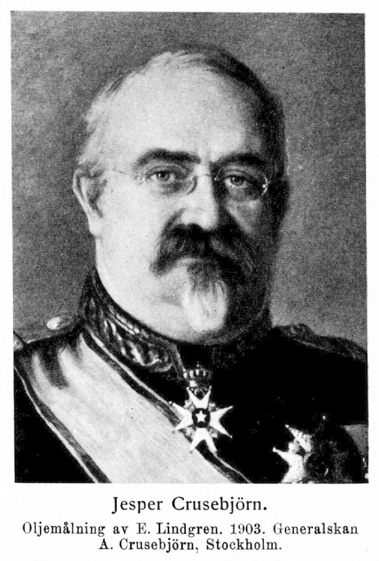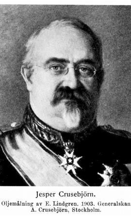 Jesper Ingevald Crusebjörn, f. 12 juli 1843 på Avinge i Grödinge socken, d. 24 juni 1904 i Umeå. Föräldrar: hovjunkaren Frans Adolf Crusebjörn och Lovisa Magdalena Fougt. Elev vid Strängnäs h. elementarläroverk ht. 1855—vt. 1862; student i Uppsala 26 maj 1862; furir utan lön vid Västmanlands regemente 8 sept. 1862; passerade graderna vid andra livgardet 1863; avlade officersexamen 26 okt. 1863. Underlöjtnant utan lön vid Västmanlands regemente 11 dec. 1863 och på stat 9 aug. 1864; genomgick krigshögskolan 1 sept. 1865—18 sept. 1867; repetitör därstädes 20 sept. 1867—31 juli 1872; löjtnant av andra klass 12 nov. 1867; tjänstgjorde tidvis i lantförsvarsdepartementets kommandoexpedition under åren 1869—74; officer vid generalstaben 14 dec. 1869; tf. lärare i topografi för tre månader vid krigshögskolan 9 juli 1872; biträdande lärare i krigskonst och krigshistoria därstädes 31 juli 1872—1877 och lärare i samma ämnen 27 juli 1878—31 juli 1882; stabsadjutant och löjtnant vid generalstaben 19 dec. 1873; adjutant vid indelta infanteriets underbefälsskola på Karlsborg 14 maj—10 sept. 1874; placerad å generalstabens krigshistoriska avdelning 1 okt. 1874—okt. 1875 och okt. 1878—1881; stabsadjutant och kapten vid generalstaben 27 aug. 1875; placerad å militärstatistiska avdelningen 15 okt. 1875—1878; kapten i Västmanlands regemente 12 juli 1878; lärare i krigskonst och krigshistoria vid artilleri- och ingenjörshögskolan 1878—10 maj 1879; brigadchef vid fälttjänstövningarna 27 juni—8 juli 1878; kompanichef vid infanteriunderbefälsskolan å Karlsborg 15 maj—13 sept. 1879; kommenderades utom riket med militärt uppdrag 28 febr. 1880 och besökte därvid Tyskland, Österrike och Serbien mars—sept. 1880; sekreterare i kommittén angående lantförsvarets ordnande 30 okt. 1880—19 juni 1882; stabschef i femte militärdistriktet 14 juli 1881—1885; deltog i norska generalstabens övningar i trakten av Vormsund och Hamar sept.—okt. 1882; sekreterare i särskilda utskottet (för härordningsfrågan) vid riksdagen 1883; ledamot av Stockholms stadsfullmäktige 1 apr. 1883—31 mars 1889 och var därunder bl. a. ledamot av drätselnämndens andra avdelning 1884 —88 och av beredningsutskottet 1886—89; överadjutant och major vid generalstaben 13 apr. 1883; tjänstgjorde vid lantförsvarsdepartementets kommandoexpedition 1884—85; tf. souschef därstädes 1 okt. 1885—30 apr. 1886 och chef för samma expedition 1886—88; stabschef under fälttjänstövningarna i Västergötland sept. 1886; sekreterare i kommittén angående nytt tjänstgöringsreglemente för armén 13 okt. 1886 och ledamot i samma kommitté 9 nov.—22 dec. 1888; överstelöjtnant och förste major vid andra livgrenadjärregementet 3 febr. 1888; överstelöjtnant och chef för Jämtlands fältjägarekår 13 juli 1888; överste i armén 11 sept. 1891; landshövding i Västerbottens län 13 nov. 1891; avgick ur armén 20 nov. 1891; ordförande i Västerbottens läns hushållningssällskap 1892—99 och 1904; ordförande i styrelsen för samma läns lantbruksskola i Yttertavle 1892; ledamot av riksdagens första kammare för Västerbottens län 1894—96, av dess andra kammare för Umeå, Skellefteå och Piteå 1897—1902 och ånyo av dess första kammare för Västerbottens län från 1903 och var därunder bl. a. ordförande i första kammarens talmansdeputation 1894; ledamot av kommittén angående lapparnas renbete 1 apr. 1895—27 maj 1896; ordförande i kommittén angående Sveriges fasta försvar 14 maj 1897—25 juli 1898; ledamot av styrelsen för Umeå byggnads-a.-b. 16 dec. 1898—9 juni 1900; återinträdde i armén som generalmajor i armén 27 okt. 1899 (med tur i generalitetet från 1891); statsråd och chef för lantförsvarsdepartementet 27 okt. 1899; generallöjtnant 7 juni 1901; avgick från statsrådsämbetet och erhöll avsked ur armén med tillstånd att kvarstå i generalitetets reserv samt återgick till landshövdingsbefattningen i Västerbottens län 27 juli 1903. — Ägde husen n:o 3 Inedalsgatan och n:o 2 Humlegårdsgatan i Stockholm. LKrVA 1876; RNO 1882; RSO 1884; KNO1kl 1893; LLA 1899; KSO1kl 1900; hedersledamot av Västerbottens läns hushållningssällskap 1900; KmstkSO 1901; innehade dessutom utländska ordnar.