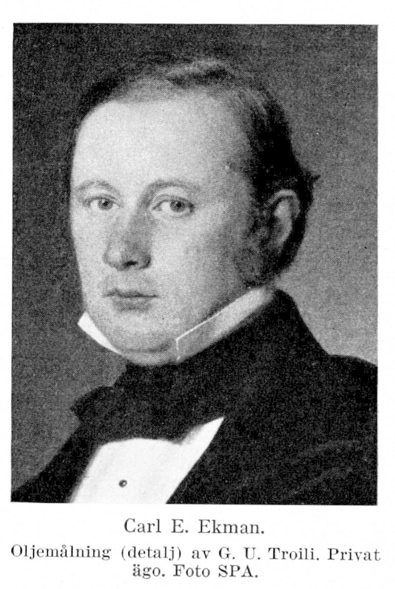 11. Carl Edvard Ekman, bror till E. 9 och E. 10, f. 7[1] mars 1826 i Göteborg (Domkyrkoförs.), d. 24 dec. 1903 där. Elev vid Beckmanska och Ekska privatskolorna i Göteborg 1833–40; elev vid Chalmersska slöjdskolan 1840, utex. därifrån 1842; elev vid bergsskolan i Filipslad 1843–44; brukselev vid Lesjöfors bruk i Ramens sn (Värml.); tillfällig elev vid bergsskolan i Falun 1846–47; studerade järnhantering i England och Skottland 1846 och 1847; delägare i Lesjöfors bruk 1847; förvaltare vid Finspångs bruk i Risinge sn (ög.) 1848; delägare i bruket 1851, ensam ägare 1856–84; inköpte Stens bruk i Kvillinge sn (Ög.) 1857; inköpte efter en sin avlidne broder Kilanda säteri i Kilanda sn (Älvsb.) 1863; ägare till Fiskeby i Östra Eneby sn, Lotorp i Kvillinge sn, m. fl. egendomar i Östergötland; grundade bl. a. stensliperi i Graversfors samt pappersbruk och massafabrik i Fiskeby; styr.-ordf. i Östgöta hypoteksförening 1876–93, Kantorps gruf a.-b. 1889–99, Östergötlands läns nya brandstodsbolag, Norsholm-Ristens kommunikations a.-b., Pålsboda–Finspångs järnvägs a.-b. 1870; Finspång–Norsholms järnvägs a.-b. 1883; grundade a.-b. Finspongs styckebruk och överlät sina bruksegendomar på detta 1884, ordf. i dess styr. 1884–99. Bergslagens deputerad i Jernkontoret 1855, 1856, 1874, 1878, 1880; e. o. fullmäktig i Jernkontoret 1862–71, fullmäktig 1880–93; led. av Östergötlands läns landsting 1863–86 (ordf. 1873–78, v. ordf. 1879, ordf. 1880–86); led. av borgarståndet för andra bruksdistriktet 1859–60 och 1862–63; led. av första kammaren för Östergötlands län 1867–93 (led. av bankoutskottet 1859–60 och 1862–63, suppl. i statsutskottet 1868–69; led! av detta utskott 1871–80, ordf. från 1875, led. av konstitutionsutskottet 1870, led. av särskilda utskottet för försvarsfrågan 1867, 1869, 1870 och 1875; led. av särskilda utskottet för arbetarfrågan 1890); led. av kommittén för inrättande av en änke- och pupillkassa för folkskollärare 1874; led. av kommittén för avgivande av förslag till åtgärder i syfte att upphjälpa den ekonomiska ställningen i landet 1886–87. RNO 1861; RDDO 1869; KVO1kl 1870; LLA 1876; HedLLA 1879; KmstkVO 1880; Jernkontorets stora guldmedalj 1883; LVA 1889, innehade flera utländska ordnar.