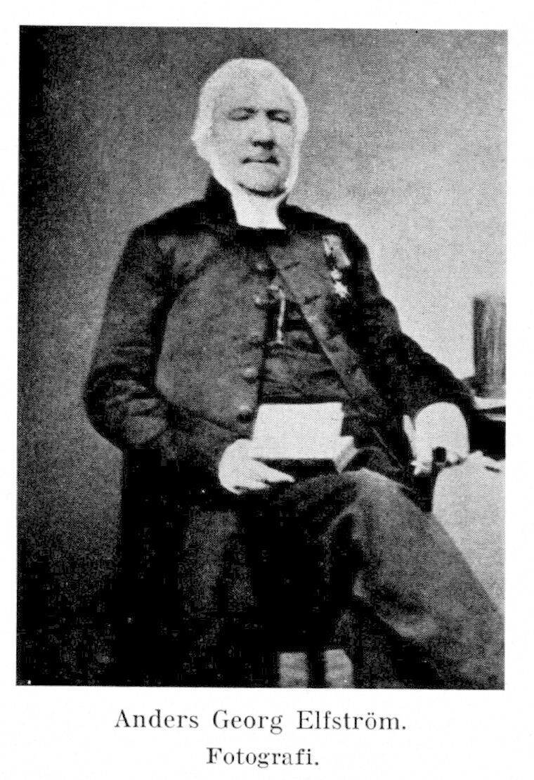 Elfström, Anders Georg, f. 1 april 1784 i Åby sn (Kalm.), d. 26 aug. 1879 i Kalmar. Föräldrar: kyrkoherden och prosten i Mönsterås Fredrik Elfström och Catharina Birgitta Ahlberg. Skolstudier i Kalmar; student vid Uppsala univ. 4 april 1803; disp. 13 juni 1807; student vid Lunds univ. 13 okt. 1809; kollega i Kalmar 13 april 1812; disp. maj 1814 i Lund; fil. magister (primus) där 22 juni s. å.; konrektor i Kalmar 1816, v. rektor ht. 1819–1 maj 1820; prästvigd i Kalmar 8 okt. 1817; pastoralex. i Lund 14 nov. s. å.; kyrkoherde i Mönsterås 25 juli 1818–1 maj 1878, tilltr. 1 maj 1820; prost över egen förs. 1 okt. 1828; teol. doktor i Uppsala 14 juni 1831; led. av prästeståndet vid riksdagarna 1828–29, 1834–35 och 1844–45; preses vid prästmötet 1836; kontraktsprost över Stranda kontrakt 31 maj 1837–1 okt. 1863. LNO 1836.