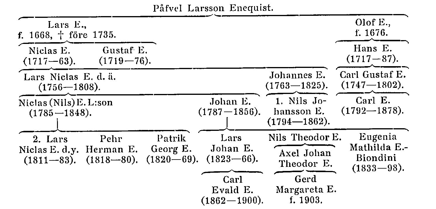 Enequist, gotländsk släkt, härstammar från borgaren och skräddaren i Visby Påfvel Larsson Enequist (f. omkr. 1629, d. 1689). Tvenne dennes söner, handlanden i Klinte Lars E. (f. 1668, d. före 1735) och skräddaren på S:t Olofsholm Olof E. (f. 1676), blevo stamfäder för var sin huvudgren av släkten. Den yngre av dessa utdog med Olof E:s sonsons son kyrkoherden i Källunge Carl E. (f. 1792, d. 1878). Denne var kompositör, spelade en stor roll i musiklivet i Visby på 1820- och 1830-talen – bl. a. förbättrade han koralsången i kyrkorna – och har efterlämnat anteckningar om musikförhållandena i Visby, nu i P. A. Säves gotländska samlingar, Uppsala univ.-bibliotek (sign. R 623: 3, n:o 636). Huvudgrenen av släkten stammar från handlanden Lars E. (se ovan), vars son Niclas E. (f. 1717, d. 1763), handlande i Klinte, Slite och Visby, samlade stor förmögenhet; om hans bror Gustaf E. se nedan. I sitt gifte med Elisabeth Maria Fåhræus hade Niclas E. bl. a. sönerna, handlandena i Slite och Visby Lars Niclas E. d. ä. (f. 1756, d. 1808), tillika skeppsredare, samt Johannes E. (f. 1763, d. 1825). Båda voro medintressenter i den gotländska kalkbruksindustrien; Johannes ägde sålunda Länna gård med kalkugn. L. N. E. d. ä. hade i sitt gifte m. Margareta Barbara Sturzenbecker bl. a. sonen franske konsuln Niclas (Nils) E. L:son (f. 1785, d. 1848), handlande i Slite och borgare i Visby. Denne köpte Länna gård av farbrodern Johannes och hade även flera andra kalkugnar; om N. E. L:sons intresse för frihamnsprojekten rörande Slite, se art. om sonen (E. 2) nedan. I sitt gifte med Catharina Lyth var N. E. L:son fader till bl. a. en dotter, g. m. konsul Lars Petter Ekman (se Ekman, ovan s. 49), och sönerna nederländske, nordamerikanske och brittiske vice konsuln Lars Niclas E. d. y. (E. 2), handlande och skeppsredare i Visby, samt kyrkoherden Pehr Herman E. (f. 1818, d. 1880) och Patrik Georg E. (f. 1820, d. 1869), handlande i Slite; den senare anlade 1859 å Länna en kolugn, som såldes av släkten 1871. En son till L. N. E. d. ä. och bror till N. E. L:son var lektorn i Visby fil. magister Johan E. (f. 1787, d. 1856), slutligen prebendepastor i Endre och kontraktsprost. Han var fader till Eugenia Mathilda E. (f. 1833, d. 1898 i London), känd under konstnärsnamnet Biondini. Efter studier vid konservatoriet i Stockholm fortsatte hon sin sångutbildning i Leipzig samt för Masset och Levasseur i Paris. Där debuterade hon på italienska scenen men var sedan främst verksam som konsertsångerska i London och Paris. Hon hade en mäktig sopranstämma och var en betydande koloratur sångerska. En brorson till henne var möbelarkitekten, mönsterritaren och etsaren Carl Evald E. (f. 1862, d. 1900). Sonsons dotter till lektorn och prosten Johan E. är professorn i geografi vid Uppsala univ. Gerd Margareta E. (f. 1903, d. 1989).