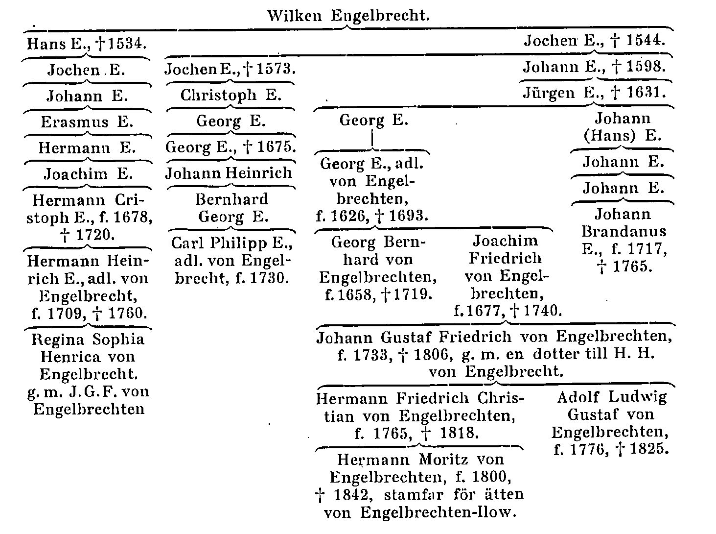 Borgmästaren Johann E. (d. 1598) var fader till handlanden i Greifswald Jürgen E. (f. 1551, d. 1631); två dennes söner bildade var sin släktgren. Den äldre av dem handlanden i Greifswald Georg E., borgare där 1624, var fader till juris professorn (1658) vid Greifswalds universitet, sedan appellationsrådet och assessorn i Wismanska tribunalet Georg E,, som 1684 adlades under namnet von Engelbrechten (f. 1626, d. 1693). I sitt första gifte med Barbara Wulfrath hade han sonen Georg Bernhard von Engelbrechten (f. 1658, d. 1719), som 1690 var envoyé till Holstein, 1702 blev regeringsråd i Bremen och Verden samt 1716 kansler där. Han var en av Sveriges representanter dels vid fredskongressen i Utrecht 1713, dels vid fredskongressen i Baden 1714, där han jämte sin chef ambassadören Erik Sparre förgäves sökte förmå prins Eugen av Savoyen och hertig de Villars att ta sig an svenska intressen. G. B. von E:s rapporter finnas i Diplomatica: Germanica, Anglica och Gallica, Riksarkivet, och andra handlingar om honom där i Bremensia, vol. 117 V2, samt brev från honom i Goertz', von Müllerns och M. Vellingks saml.; två likvidationer rörande honom finnas i Kammararkivet. Dessutom finnas spridda brev från honom i Uppsala univ.-bibliotek (F 191, E 519, E 521, E 523–527, H 236 a). Han var g. m. sin styvmoders halvsyster Maria von Mevius, dotter av den berömde juristen vice presidenten i Wismarska tribunalet David von Mevius. År 1727 utdog G. B. v. Engelbrechtens gren på manssidan.