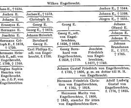 Engelbrecht, en av det svenska Pommerns större och mera betydande släkter, utgrenad i adliga ätterna von Engelbrecht och von Engelbrechten. Släkten härstammar från rådmannen i Greifswald 1489–1502 Wilken Engelbrecht. Med hans två söner, handlanden i Greifswald Hans E. (d. 1534) och rådmannen där 1503–44 Jochen E. (d. 1544) delade sig släkten i en äldre och en yngre huvudlinje. Hans E:s sonsons sonsons sonson protonotarien vid hovrätten i Greifswald, titulära hovrådet Hermann Christoph E. (f. 1678, d. 1720), var fader till vice presidenten i Wismarska tribunalet Hermann Heinrich E., som 1744 erhöll rikstyskt adelskap med namnet von Engelbrecht (se s. 564). Han slöt sin ätt på manssidan; hans ena dotter äktade sin avlägsne frände Johann Gustav Friedrich von Engelbrechten (se s. 562).