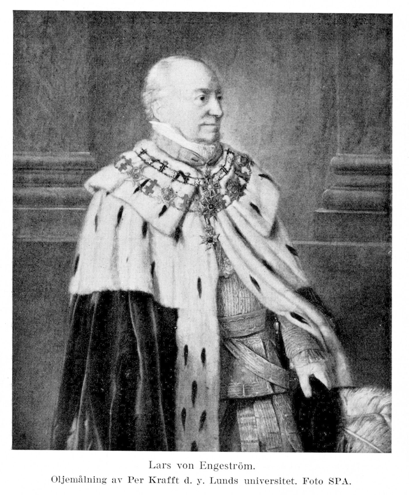 5. Lars von Engeström, son av E. 1 och bror till E. 2, E. 3 och E. 4, f. 24 dec. 1751 i Lund, d. 19 aug. 1826 på godset Jankowice, Posen, Polen. Student vid Lunds univ. 11 jan. 1757; teol. ex. där 9 mars 1768; jur. ex. 28 april 1770; e. o. kanslist i Riksarkivet 27 nov. s. å.; kopist där 12 juni 1771; kanslist 23 mars 1773; registrator 20 juli s. å.; andre sekr. i Presidentkontoret 12 okt. s. å.; förste sekr. där 11 juni 1776; led. av ridderskapet och adeln vid riksdagen 1778; chargé d'affaires i Wien 7 nov. 1782, i Warszawa 11 nov. 1787; ministerresident i Warszawa 17 aug. 1788; envoyé där 28 maj 1790; hovkansler 16 juli 1792; envoyé i London 21 juli 1793–1795, i Wien 17 juli 1795, men tillträdde ej den senare posten; envoyé i Berlin 5 april 1798; avsked från hovkanslersämbetet 22 aug. s. å.; rappellerad från Berlin 5 sept. 1803; kanslipresident 16 maj 1809; statsminister för utrikes ärendena och en av rikets herrar 9 juni s. å.; friherre enligt 37 § RF 29 juni 1809; ordförande i pommerska beredningen 6 april 1810; Lunds universitets kansler 16 juni s. å.; greve enligt 37 § RF 28 jan. 1813; kansler för Lantbruksakademien 1814; avsked från statsministerämbetet 8 juni 1824. RNO 1790; HedLHA 1793; KNO 1805; RoKavKMO 1809; HedLFrKA s. å.; LVA 1810; RCXIII:sO 1811; HedLLA 1812; LMA 1814; HedLFS 1815; innehade även flera utländska ordnar.