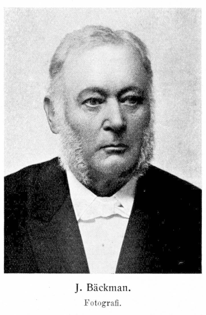 Tryckta arbeten: Svensk rättstafningslära för folkskolor. Gävle 1858. 12: o (4), 28 s. — Reglor för de enkla talen samt minnesräknings- och reduktionstabeller, till folkskolornas tjenst. Gävle 1858. 24 s. — Läsebok för folkskolor. En ur flera förf: s skrifter vald samling af så väl obunden som bunden stil. Sthm 1859. 12: o X, 295 s. 4:e öfvers. uppl. Sthm 1866. 12: o 294, IV s. — Thora. Berättelse, upptecknad af Jones. Varberg 1861.16 :o 10 s. (Pseud.) (För aftonstunden. Trenne noveller. 2.) — Lärobok i bibliska historien, innehållande 35 berättelser ur Gamla och 60 berättelser ur Nya testamentet. För folkskolor utg. Varberg 1862. 12: o 92 s. 4:e uppl. Varberg 1865. 12: o 100 s. l:a uppl. med psalmverser. Varberg 1865. 12: o 144 s. 25 :e uppl. Med 2: ne kartor och en kort beskrifning öfver Palestina... Sthm 1876. 12: o 108 s., 1 kartbl. 36 :e uppl. Berättelserna ur Gamla testamentet oförändrade, men de ur Nya. testamentet ordnade enl. gällande normalplan och omarb. . , . Sthm 1886. 12: o 108 s., 1 kartbl. 37:e uppl. med titel: Bibliska historien i sammandrag för folkskolor... Sthm 1891. 12: o 128 s. 43 :e uppl. Sthm 1918. 128 s. (37:e och följ uppl.: Bäckmans Bibliska historia för folkskolan N: o 5.) — Tillämpad geometri med talrika öfningsexempel, framställda efter nya sortsystemet. Ett försök, till tjenst för folkskolelärare-seminarier ... utg. Sthm 1862. 2: a öfvers. uppl. Sthm 1868. VII, 128 s. + (svar) 16 s. 4:e uppl. bearb. med afs. på det metriska systemet. Sthm 1879. VII, 134 s. + 16 s. 6:e omarb. uppl.: Tillämpad geometri, med talrika räkne-exempel enl. de metriska måtten jämte rit-öfningsuppgifter. Sthm 1892. VIII, 184-)-15 s. 9:e uppl. Sthm 1908 (ny tr. 1912). VIII, 196 +lös. — Handbok i arithmetiken, till skollärares tjenst utg. Bok 1—2. Sthm 1862—63. Del 1: (5), 88 s. — Nummereqvationer af första graden med en obekant... För skolor och sjelfstudium utg. Sthm 1863. 12: o. — Läsning för Sveriges allmoge. Bok 1—4. Härnösand 1864—66. 1. Om skrifkonsten, boktryckerikonsten och papperet. 1864, 71 s. 2. Om christendomens predikande i Sverige från år 829 till mot slutet af 900-talet. 1865. 59 s. 3. Om christendomen i Sverige från slutet af 900-talet till år 1164. 1865. 126 s. 4. Om tideräkningen och de christna högtidsdagarne. 1866. 290, (2) s. (Anon.) — Folkskolans räknebok, innefattande hela tal, decimalbråk och nya sorter, gamla sorter och allmänt bråk . . . Sthm 1864. 146 + (svar) 32 s. 4:e uppl. Kurs 1—2. Sthm 1874. 48 + 11 s.; 104 +27 s. 5:e uppl. bearb. med afs. på det metriska systemet. Kurs 1—2. Sthm 1877 —78. (4), 48 + 11 s.; 109, (2)+24 s. 8:e uppl. omarb. med ledn. af folk-skolelärobokskommitténs utlåtande. Årskurs 1—4. Sthm 1888—89. 40 + 8 s.: 70 + 12 s., 1 pl.; 52 + 12 s.; 79 + 16 s. Årskurs 1. 14: e uppl. Sthm 1912. 53 + 15 s.; årskurs 2. 12 :e uppl. Sthm 1912. 70+12 s.; årskurs 3. 13: e uppl., omarb. av J. P. Andersson. Sthm 1920. 36 + 11 s.; årskurs 4. 12: e uppl. Sthm 1912. 79 + 16 s. — Folkskolans naturlära, till begagnande vid de öfversta afdelningarne sammandragen efter J. M. Winge, C. J. Hartman ... Sthm 1864. IV, 155 s. (Anon.) 3:e öfvers. och tillökta uppl. Bok 1—2. Sthm 1871—73. VIII, 285 s.; (5), 175, (1) s., 1 pl. — Lärobok i geografien, lämpad efter T. A. v. Mentzers kartor. För lägre läroverk!. . . Efter den af P. B. Sköldbergs bearb. 7:e uppl. af L. S. Platou's Geografi för begyn-nare. Kurs 1—2. Sthm 1865—66. IV, 162 s.; 266 s. — Läse- och lärobok i allmänna historien för lägre läroverk i allmänhet samt folkskollärare-seminarier i synnerhet. Efter G. G. Bredowm. fl. bearb. Sthm 1866. 12: o IV, 296 s. — Naturalhisto-ria. En läsebok för skolan och hemmet, efter dels svenska och dels utländska arbeten, sammandragen och bearb. D;.. 1—2. Sthm 1867—69. 16: o (4), 147, (1) s.; 150, (2), II, IV s. — Den lilla affärsboken, innehållande anvisning om bokhålleri eller räkenskapsföring ... m. m. Till allmogens och folkskolans tjenst. Härnösand 1868. (4), 68 s. 3: c uppl., öfversedd o. tillökt. Härnösand 1880. (4), 76 s. — Praktisk lärokurs i svenska språket, för seminarier, lägre skolor och folkskolor bearb. Afd. 1*. Rättstafningslära, med talrika skriföfningar. Gävle (tr. Sthm) 1868. 12: o 80 s. 2: a öfvers. uppl.: Svensk rättstafningslära... För seminarier... bearb. Gävle 1871. 12: o (4), 80, (1) s. — Läse- och lärobok i geografien. För folkskolor och begynnare. Varberg 1868—69. 16: o 228 s. 5:e uppl., omarb. Sthm (tr. Norrköping) 1883. 8: o IV, 251, (1) s. (5:e upp].: Bäckmans Geografi N:o 1.) — Lätta stilöfningar i svenska språket, i förbindelse med språklärans allmännaste grunder____ Gävle (tr. Sthm) 1869. 12: o (4), 89, (2) s. — Sveriges historia, för folkskolelärare-seminarier och folkskolor sammandragen och bearb. Gävle 1870. 12: o (8), 184 s., 2 pl. 2: a uppl. Gävle 1874. 12: o 150 s., 2 pl. — Folkskolans geometri, innefattande de enklaste grunderna om-linjers, ytors och kroppars uppritning och beräkning. Sthm 1872. (2), 70 s.+ (svar) 8 s. (Förkort, uppl. med titel: Folkskolans geometri i sammandrag . . . Sthm 1872. (2), 61 +8 s.) 18: e uppl. Sthm 1921. (2), 92 + 11 s. — Handledning i räkenskapsföring, med öfnings-exempel. För folkskolor utarb. Härnösand 1873. 20 s. 2: a uppl., öfvers. o. tillökt. Härnösand 1880. (2), 26 s. — Lärobok i geografien, för folkskolor sammandragen. Falun (tr. Sthm) 1876. 16: o 134 s. 3:e uppl., omarb. Sthm (tr. Norrköping) 1884. 12: o 129, (1) s.. 4:e uppl., öfvers. med ledn. af folkskolelärobokskommitténs utlåtande. Sthm (tr. Norrköping) 1888. 12: o (4), 124 s. 9:e uppl., öfvers. Sthm (tr. Norrköping) 1903. 8: o (4), 123 s. (3:e och följ. uppl.: Bäckmans Geografi N:o 2.) — Meter-systemet. Med talrika räkneuppgifter. För skolor och till ledning vid sjelfundervisning. Sthm 1879. 47 + (svar) 8 s. — 