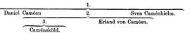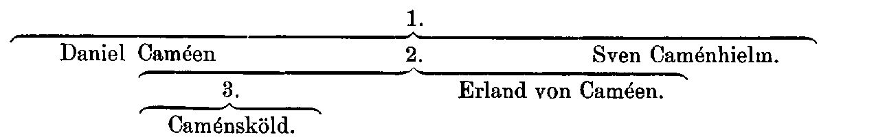 Caméen, tidigare Camoenius, släkt, härstammande från Jonas i Rangedal (d. 1537), som omkr. 1480 blev kyrkoherde i Älvdalen i Värmland och sedermera antog luterska läran. Han efterföljdes i pastoratet av sonen Ericus Jonae (f. 1483, t 1588) och sonsonen Benedictus Erici (f. 1559, d. 1634), fader till superintendenten i Karlstad Sveno Benedicti Elfdalius Camoenius (se nedan 1), med vilkens söner Daniel, Benedictus och Sven släkten delade sig i olika grenar. Från den äldste av de tre bröderna, A) justitieborgmästaren i Stockholm Daniel Caméen (f. 1625, d. 1692), adlad 12 dec. 1687 med bibehållet namn, härstammar en möjligen i Ryssland fortlevande ätt. En son till honom var kaptenen vid dalregementet Svante C. (f. 1669, stupade 1703 i polska kriget).[1] Den mellersta brodern, B) superintendenten i Karlstad Benedictus Svenonis C. (se nedan 2) blev fader a) till biskopen i Västerås Sven Benedicti C. (se nedan 3), vars barn 14 sept. 1726 blevo adlade Caménsköld men själva slöto sin ätt, och b) till kommerserådet Erland C. (f. 1670, d. 1729), som 6 maj 1720 adlades von Caméen men likaledes själv slöt sin ätt; han hade under en långvarig vistelse i England och Holland förvärvat ingående kännedom om handeln på västra Europa och räknades i sitt kollegium bland de mera framträdande representanterna för den begynnande frihetstidens handels- och industrivänliga näringspolitik. Den tredje av superintendenten Sveno Benedicti Camoenius ovannämnda söner C) Sven Caméen (f. 1658, d. 1708) blev professor i historia vid akademien i Dorpat (sedermera i Pernau) 11 apr. 1689 samt landrichter på Ösel 16 okt. 1701 och v. landshövding därstädes; adlad Caménhielm 7 nov. 1701, slöt han själv sin ätt.