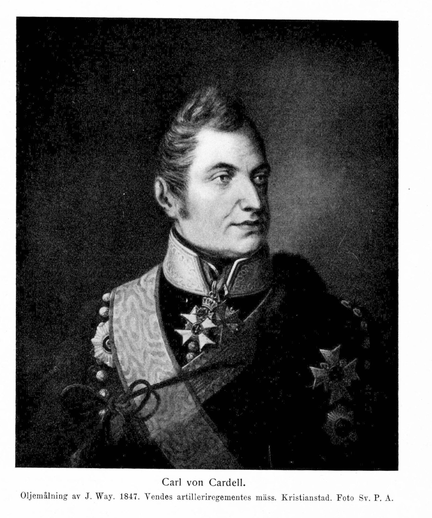 Cardell, Carl Friedrich von, f. 1764 (döpt 19 apr.) 1 Demmin i preussiska Pommern, d. 17 sept. 1821 i Stockholm. Föräldrar: justitieborgmästaren i Demmin Karl Friedrich Kobes och Wilhelmine Eleonore Kohlhard. Elev sannolikt vid Demmins latinskola och vid Stettins gymnasium 3 okt. 1779. Inträdde i preussisk krigstjänst vid pontonjärkåren i Berlin 1780; avlade officersexamen 1786; officer vid pontonjärkåren 1786; sekundlöjtnant 30 maj 1787; erhöll transport till artilleriet 1787; kapten i svensk tjänst vid von Hintzensternska infanteribataljonen i Pommern 17 maj 1789 (med konfirmationsfullmakt 20 okt. 1790); erhöll avsked ur preussisk tjänst 9 mars 1790 och tillstånd att övergå i svensk tjänst 7 jan. 1791: tysk adelsman med namnet Kobes von Cardell 11 okt. 1790; kapten å extra stat vid Psilanderhielmska regementet 10 mars 1791; informationskapten vid stralsundska artilleribataljonen 31 maj 1792; major i armén 26 juli 1792; major för en ridande artilleribrigad 1 dec. 1792; major vid artilleriet och brigadchef för ridande artilleriet i Stralsund 1 juli 1793; erhöll transport till Stockholm 1794; överstelöjtnant i armén och generaladjutant av flygeln 11 mars 1795; överstelöjtnant i Vendes artilleriregemente 1797, vid regementet 19 aug. 1799; överste i armén och konungens generaladjutant 31 mars 1802; ledamot av artillerikommittén 1804 —05; chef för ridande artilleribrigaden under pommerska kriget 1805—07; överste och chef för Vendes artilleriregemente 7 mars 1807; brigadchef vid södra armén 18 mars 1808 och vid samma armés artilleribrigad 24 mars 1808; svensk adelsman 29 juni 1809;. chef för reservartilleriet vid svenska armén i Tyskland 1813; generalmajor i armén 10 sept. 1813 (konfirmation 19 okt. 1813); befälhavande generaladjutant för artilleriet 1814; bevistade riksdagarna 1815 och 1817–18; militär ledamot av krigskollegiet 11 juli 1815;. ledamot av kommittén angående likvid mellan kronan och överstelöjtnanten Ch. Appelqvist för styckgjuteriet å Marieberg 4 aug. 1815–16 mars 1816; generalfälttygmästare och chef för allt artilleri 23 jan. 1816; chef för artilleriläroverket å Marieberg från 1818 (jmfr K. brev 24 febr.); friherre 11 maj 1818; ledamot av kommittén angående undervisningen vid krigsakademien å Karlberg 2 dec. 1818–10 maj 1819 och av befästningskommittén 16 febr.– 12 maj 1819; generallöjtnant i armén 29 febr. 1820. Stiftande LKrVA 1796; RSO 1805; KSO 1814; RmstkS02kl 1814; HedLKrVA 1815; KmstkSO 1817; innehade dessutom utländska ordnar.