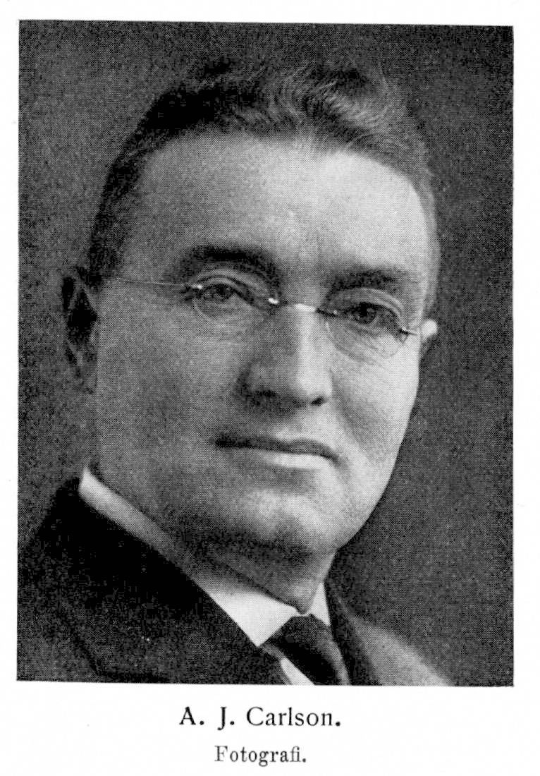 Carlson, Anton Julius, f. 29 jan. 1875 i Svarteborgs socken. Föräldrar: hemmansägaren Karl Anderson och Hedvig Jacobson. Elev vid folkskolan i Kville församling; utflyttade till Chicago 1891; studerade vid aftonskola därstädes 1891–93 samt vid Augustana academy och Augustana college från 1893; bachelor of arts vid Augustana college juni 1898; master of arts juni 1899; studerade vid Leland Stanford junior university 1899–1903; fil. doktor där maj 1902; har företagit en studieresa till Europa 1910 samt bevistat fysiologkongresser bl. a. i Stockholm 1926. Demonstrator i fysiologi vid marinlaboratorierna i Monterey juni–aug. 1900, 1901 och 1902, San Diego juni–sept. 1903 och i Woods Hole juni–sept. 1904 och 1905; assistent i fysiologi vid Stanford university 1903; research assistent vid Carnegie institution of Washington juni 1903–maj 1904; demonstrator i fysiologi vid university of Pennsylvania 1 okt.–3 dec. 1904; biträdande professor i fysiologi vid university of Chicago 1904–08; biträdande redaktör för American journal of physiologi 1905–25; professor i fysiologi vid university of Chicago 1909; styrelseledamot av och sekreterare i American physiological society 1909–14; ordförande för fysiologiska sektionen av American medical association 1913–14; kapten, major och överste i Sanitary corps vid Förenta staternas armé 1917–18; studerade näringsproblem i Tyskland, Böhmen, Österrike, Serbien, Polen, Finland och Östersjöprovinserna 1918–19; president of American physiological society 1923–26; president, section N, American association for the advancement of science 1925–26. Är ledamot av amerikanska Vetenskapsakademien och andra vetenskapliga samfund; med. hedersdoktor i Lund 27 sept. 1918.