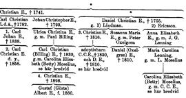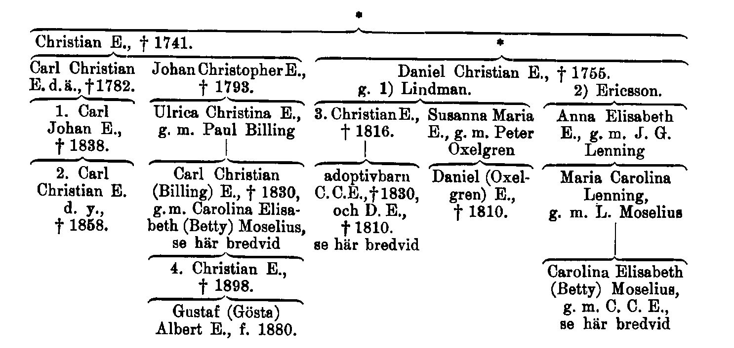 Regementsfältskären C. E:s (se ovan)brorson Daniel Christian E. (f. 1707, d. 1755) inkom 1724 från Prenzlow till Sverige och blev stadskirurg i Norrköping samt stamfar för äldre Norrköpingsgrenen. Hans son var grosshandlaren i Norrköping, skeppsredaren och donatorn, brukspatron Christian E. (E. 3). Själv barnlös slöt denne sin gren 1816. Han upptog emellertid som adoptivbarn dels två systerbarn (barn av handlanden i Norrköping Peter Oxelgren och Susanna Maria E.), av vilka den ene var grosshandlaren och riksdagsmannen Daniel (Ox el g ren) E., om vilken se nedan, dels sin farfars brorson (regementsfältskären C. E:s yngre son) prosten i Ystad Johan Christopher E:s (f. 1719, d. 1793) dotterson. Denne (son av direktören Paul Samuelsson Billkig — jfr del 4, s. 362 — och Ulrica Christina E.), grosshandlaren i Norrköping Carl Christian (Billing) E. (f. 1787, d. 1830), var även besläktad med sin adoptivfader genom sin hustru, Carolina Elisabeth (Betty) Moselius, som var dotterdotter till rådmannen, handlanden och klädesfabrikören i Nyköping, riksdagsmannen Johan Gustaf Lenning och Anna Elisabeth E., brukspatron C. E:s halvsyster.