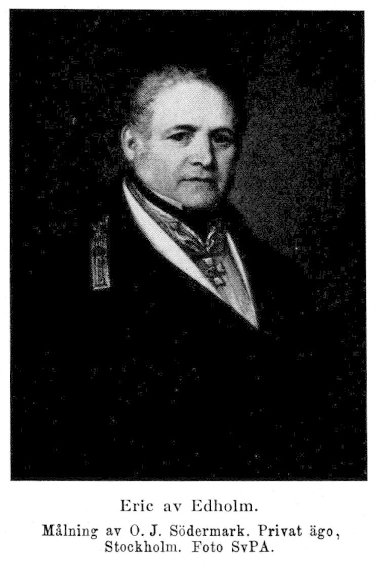 1. Eric af Edholm, före adl. Edholm, f. 5 febr. 1777 i Utanede, Fors' sn (Jämtl.), d. 29 maj 1856 i Stockholm (Hovf.). Föräldrar: vice länsmannen Mårten Esbjörnsson Edholm och Magdalena Åström. Genomgick Frösö trivialskola; student vid Uppsala univ. 9 febr. 1796; disp. pro exercitio 17 febr. 1802; med. fil. kand. våren 1803; underläkare vid Sätra hälsobrunn 1806; med. kand. 27 maj 1807; med. lic. 3 juni s. å.; ledsagade greve Magnus Brahe på dennes rekreationsresa till Finland och S:t Petersburg 1807; disp. pro gradu 8 juni s. å.; underkirurg vid Serafimerlasarettet 1809–12; kir. magister 1810; med. doktor 12 juni (promov. 14 juni) s. å.; ledsagade som läkare greve Magnus Fredrik Brahe i dennes ambassad till Paris 1811; läkarstudier där tre månader; fattigläkare i S:ta Klara församling i Stockholm samt enskild läkarpraktik där från april 1812; livmedikus hos kronprinsen Karl Johan och arvprinsen Oskar 6 maj s. å.; åtföljde s. å. kronprinsen till mötet i Åbo samt som fältläkare i Tyskland och Norge 1813–14; tjg. förste livmedikus hos Karl XIV Johan 1818; adjungerad led. i Sundhetskollegium s. å.; assessor där 20 febr. 1821; adlad 5 juni s. å.; vice ordf. i Sundhetskollegium 15 jan. 1822; led. av Stockholms stads brandförsäkringskontors överstyrelse 1828 och av dess direktion 1836–56; led. av direktionen över Nya elementarskolan 1839; ordf. i Sundhetskollegium 11 sept. 1841–30 mars 1849; Karl XIV Johans förste arkiater 1842; ordf. i K. sällskapet Pro Patria 1842–52; förste arkiater hos Oskar I samt hos änkedrottningen Desideria 1844; led. av ridderskapet och adeln vid riksdagarna 1823, 1828–30, 1834–35, 1840–41, 1844–45, 1847–48, 1850–51. RVO 1814; led. av K. Norske Videnskabers Selskab 1818; LVA 1819 (preses 1830–31); korresp. led. av Societé académique de médecine de Marseille 1819; RNO i briljanter 1825; korrespLLA 1827; KVO 1832; KmstkVO 1842; CXIVJM 1855; erhöll även utländska utmärkelser.