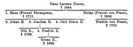 Ehrenpreus, släkt. Hans Larsson Preuss (Preutz, Prytz), som av Kammarkollegium i april 1632 förordnades till myntinspektor i Nyköping och 1638 blev justitieborgmästare där (d. 1644), hade bl. a. två söner, som adlades med olika namn. Den yngre av dessa, Niclas Preuss, adelsman 1678 med namnet von Preutz (f. 1639, d. 1696), fick 1665 burskap som handlande i Göteborg och hade vidlyftiga affärer med kronan, särskilt som leverantör till armén och flottan. Han försåg 1669–70 garnisonen i Göteborg med klädespersedlar, namnes 1671 som vinimportör av »sköna och oförfalskade drycker» och var en av de ledande inom den göteborgska sjöfarten. Under danska kriget gjorde han stora försträckningar till kronan (jfr nedan s. 301) och blev 1676 kommissarie vid flottan i Göteborg samt tillika assessor vid amiralitetet där, fick avsked 1680 och erhöll kommerseråds titel 1690. Ätten utgick på manssidan redan med hans son löjtnanten Fredrik von Preutz (f. 1675, d. 1701), som avled av sina vid Narva undfångna blessyrer. Han är känd som skald; en hans dikt från 1700 är tryckt av Sigrid Leijonhufvud i Ord och Bild 1900. – En Hans Larsson Preuss' äldre son var rådmannen i Stockholm, faktorn i Arboga och Örebro, tituläre överinspektören Hans Preuss, som 1694 (ej 1695) adlades med namnet Ehrenpreus (E. 1). Bland dennes barn i första giftet voro sönerna överdirektören vid Stora sjötullen, bruksägaren Johan (Hans) E. (E. 2) och överdirektören vid gevärsfaktorierna Joachim E. (E. 3), den sistnämnde i sin tur fader till faktorn vid Jönköpings gevärsfaktori Nils E. (se s. 312 nedan) samt överdirektören vid nämnda gevärsfaktori Fredrik E. (E. 4); om dennes son Göran E. se s. 320 nedan. Den adliga grenen utdog med en dennes sonson 1848. En son till överinspektören Hans (Preuss) E. i hans tredje gifte var riksrådet och universitetskanslern Carl Didric E. (E. 5), som 1747 blev friherre samt 1751 greve (som sådan ej introducerad) och själv slöt sin gren av ätten.