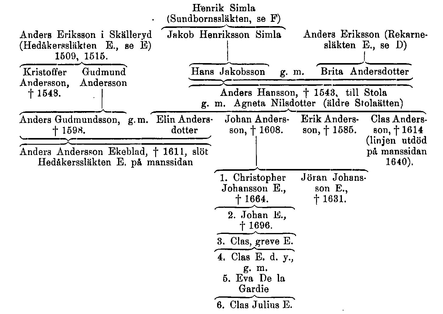 A. Västerfärnebo-släkten E. Eklövet som heraldisk bild återfinnes i Sverige 1344 i sigill (fragment jämte sigillritning i Skokloster, I, Fol., vol. 214, p. 18 v) för Kettilbjörn Ingebjörnsson och 1348 i sigill för väpnaren Karl Ingebjörnsson (namnes 1341–70), som var fogde i Dalarna 1351 och häradshövding 1366 i Åkers härad (Söd.). Då en deras bror ägde jord i Västerfärnebo sn (Västm.), voro de troligen söner av jordägaren där Ingebjörn i Rörabo, som namnes 20 juli 1336 och vars namnform snarast är en bondes. Bror till Karl var även väpnaren Lars (Laurens) Ingebjörnsson (nämnes 1346–79), som också var fogde i Dalarna (1362) och som två år tidigare anges som hertiginnan Ingeborg Håkansdotters fogde på Dåvö (Västra.). Son till Karl var väpnaren Folke Karlsson (namnes; från. 1377), som ägde jord i Västmanland och tydligen 1386 dog samt slöt ätten. – B. Ödeby-släkten E. Ätten är i huvudsak utredd av N. G. Djurklou (1890), dock med vissa genealogiska misstag. Den förste av denna släkt, som förde ett eklöv, var underlagmannen i Västmanland 1424 och häradshövdingen i Snävringe härad (Västm.) 1432 Jöns Karlsson, vars sigill med vapnet är känt från fyra brev 1424–31 och som 1445 skrev sig till Ön i Ödeby sn i Närke. Eklövet förde även hans två söner Karl Jönsson (namnes 1455–85) till Berg i Ödeby och Paine Jönsson (namnes 1470–91) till Tuna i samma sn, den senare ingift i en känd lågfrälsesläkt från Yxta(holm) i Lilla Mällösa sn (Söd.) och svärfar till Gustav Vasas tre fogdar Bengt Eriksson Skrivare, Nils Henriksson och Sven Frijs. I pergamentsbrev 11 febr. 1513 (RA) tilldömdes Karl Jönssons son, borgaren i Stockholm Anders Karlsson, fädernegården Berg, som han dock några dagar senare sålde. Den sistnämnde blev rådman och kämnär i huvudstaden och var skottherre 1516. Anders deltog i stadens underhandlingar med Sten Sture d. y. och Kristian II i aug. 1518 å Gråmunkeholmen och i sept. s. å. vid Kaknäs, medbeseglade 8 sept. 1520 stadens hyllningsbrev till konungen och avrättades i Stockholms blodbad 8 nov. s. å. Uppgift om en hans son har ej kunnat verifieras. Oriktig är notisen (hos E. Hildebrand), att denne rådman skulle varit far till riksrådet Kristoffer Andersson, vilken tillhörde en helt annan släkt (se E nedan). – C. Släkten Tasto. Med släkterna A och B ovan samt den senare Stola-ätten E. (F nedan) har ibland hopblandats en släkt Tasto, som är föga känd. Väpnaren Mickel Tasto (nämnes 1444–63, var död 1478) förde ett eklöv i sigillet och var utan tvivel son till väpnaren Magnus Mickelsson Tasto (namnes 1399–1418), enär båda ägt jord i Oppeby, Helgesta sn (Söd.). Magnus' sigill synes, i motsats till vad som hävdats i litteraturen, vara okänt; han kallas »beskedlig man», vilket vittnar om socialt låg ställning och börd. — D. Rekarne-släkten E. I Österrekarne (Söd.) spåras 1462–66 en väpnare Erik Andersson, som var jordägare i bl. a. Husby-Rekarne; hans hustru Katarina Andersdotter namnes 1470 och var då tydligen omgift. Både Erik och Katarina uppgivas ha fört ett eklöv, men den förres sigill är numera förstört och den senares alltför otydligt för att säkert tillåta denna slutsats. Däremot har deras son väpnaren Anders Eriksson (namnes 1470–95), som omtalas som häradshövding i Österrekarne 1478–90, fört eklövet. Detta visar både en teckning av hans sigill 14 maj 1478 (L. Sparres kopiebok B 16, RA) och hans originalsigill 29 aug. 1486, vilket feltolkats (H. Lagergren 1923) som pil. Denne Anders har särskilt intresse som mödernestamfar till Stolaätten E. (F nedan). Han äktade 1486 Ingeborg Markvardsdotter (Link), dotter av fogden i Vartofta härad (Vg.), sedan häradshövdingen i Åkers härad (Söd.) Markvärd Link. Troligen genom sidoarv kom gården Sövsta (i Stenkvista sn, Söd.) till Anders Eriksson, som bebodde den 1489. Det är på grund av Anders' och Ingeborgs dotter Brita Andersdotters andra gifte med Hans Jakobsson (av dalasläkten Simla) till Krokfors i Sundborns sn (Kopp.), som eklövet upptogs av deras son Anders Hansson till Stola i Strö sn (Skarab.) (se F och vidare nedan). – E. Hedåkers-släkten E., som i vapnet förde tre eklöv, bar i äldre generationer ej fixerat släktnamn men i sista generation namnet Ekeblad. I litteraturen har den vanligen gått under de heraldiska namnen Ekelöf, Eklöf eller eklöv samt också som »Röd». Sistnämnda namn har uppkommit därigenom, att den fantasilike och föga självständige 1700-talsgenealogen J. O. Åkerstein anger, att ätten härstammar från en frälseman »Anders kallad Röd» 1450, hittills ej belagd i urkunderna, liksom ej heller hans av Åkerstein angivna söner Erik och Nils. Troligen föreligger förväxling med häradsdomhavanden i Österrekarne, väpnaren Nils (Nisse) Rödh (namnes 1425–37), som även ägde jord i Västmanland. Denne tycks ha fört blad (ovisst om eklöv) i skölden men kan icke knytas till någon av ekebladssläkterna. Hedåkerssläkten E. är aldrig kritiskt genealogiskt utredd. Dess tre eklöv fördes antingen två och ett (Kristoffer Andersson, Gudmund Andersson, Anders Gudmundsson) eller stolpvis ställda, bjälkvis ordnade, utgående från gemensamt fäste och med ett eklöv mellan hjälmens två horn (Anders Eriksson d. y.). Vapnets tinkturer växla och äro osäkra. Stamfadern, frälsemannen Anders Eriksson (1509, 1515) – enligt släktböcker från 1500-talets mitt son till en Erik Andersson – ägde sätesgården Skälleryd (Skelderid, Skelleryd, nu Sällerhög) i Asklanda sn (Älvsb.). Han förde de tre eklöven, var g. m. Anna, dotter av häradshövdingen Gudmund Torbjörnsson (bagghuvud) i Forstena, och hade fyra söner. Den märkligaste av dessa är den bekante politikern Kristoffer Andersson (d. 1548), vars gren gick upp i högfrälset. Han skrevs 1537 till Hedåker (Hyringa sn, Skarab.), 1541 till Sk