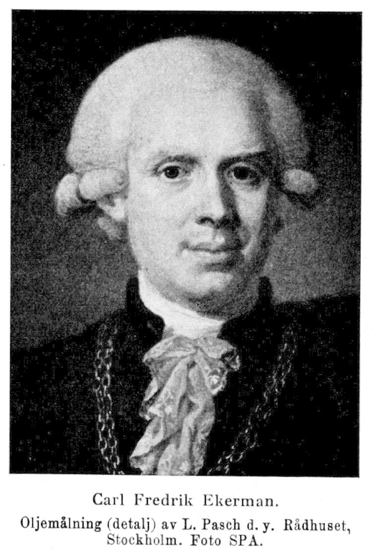 2. Carl Fredrik Ekerman, dp 30 jan. 1743 i Stockholm (Kat.), d. 23 juni 1792 där (Maria). Föräldrar: stadssekreteraren och rådmannen i Stockholm Samuel Ekerman och Rebecka Charlotta Falck. Student vid Uppsala univ. 27 jan. 1752; auskultant vid Stockholms rådhus och kämnärsrätter 5 juni 1758, vid Svea hovrätt 12 febr. 1760; primariekämnär vid Södra kämnärsrätten 3 okt. 1770; rådman i Stockholm 25 okt. 1775; borgmästares n. h. o. v. 26 jan. 1779; justitieborgmästare i Stockholm 31 dec. 1783; borgarståndets talman vid 1778–79 års samt 1786 års riksdagar; riksdagsman i borgarståndet även 1789; ordf. i Samfundet Pro fide et christianismo 1788.