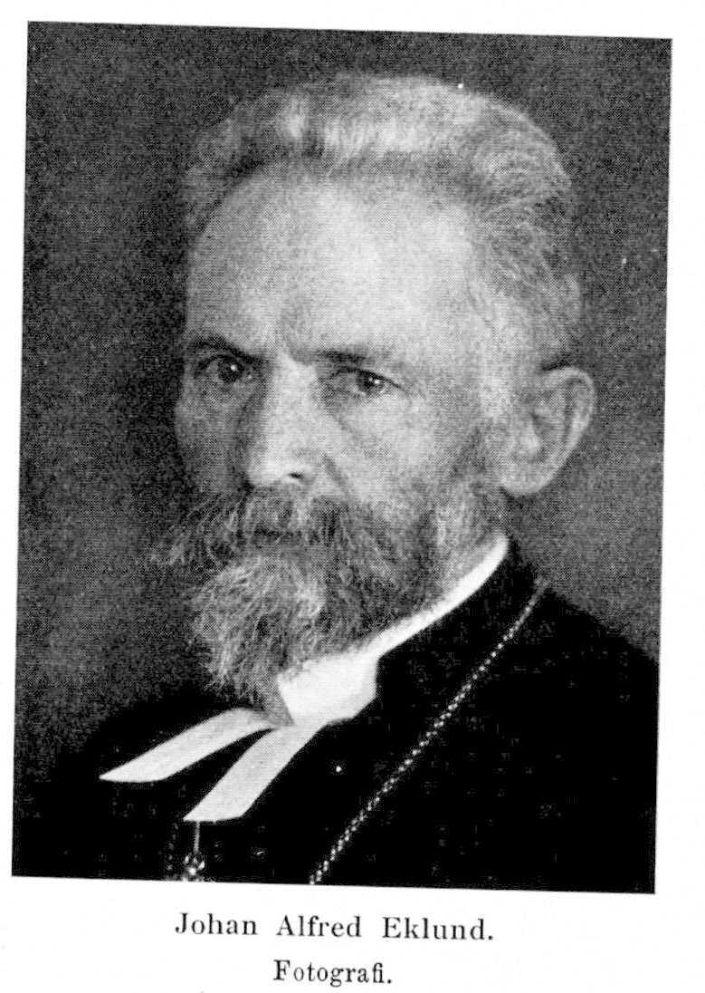 Eklund, Johan Alfred, f. 7 jan. 1863 i Ryda sn (Skarab.), d. 23 aug. 1945 i Skärmnäs, Brunskogs sn (Värml.). Föräldrar: skräddaren Andreas Andersson och Greta Olofsdotter. Elev vid Skara h. allm. läroverk vt. 1878; mogehhetsex. där 6 juni 1883; student vid Uppsala univ. 15 sept. s. å.; teol. fil. ex. 30 maj 1884; teor. teol. ex. 31 jan. 1887; e. o. lektor i Göteborg ht. 1889–vt. 1892; teol. kand. 24 jan. 1890; prästvigd för Skara stift 10 jan. 1892; biträde hos pastor i Borås 15 juli 1892; komminister i Västra Tunhem 24 febr. 1894, tilltr. 1 maj s. å.; domkyrkovicepastor i Uppsala 15 april 1896, tilltr. 1 maj s. å.; docent i apologetik 8 juni s. å.; uppehöll professuren i teologiska prenotioner och teologisk encyklopedi 4 sept. 1899–30 juni 1900; domprost i Kalmar 13 juni 1902, tillträdde 1 juli s. å.; biskop över Karlstads stift och kyrkoherde i Stora Kil 22 febr. 1907, tog inträde i domkapitlet 16 juni s. å., tilltr. lönen 1 maj 1909; utnämnd teol. doktor 26 april 1907; frånträdde prebendet Stora Kil 1 maj 1921; biskop emeritus 1 april 1938; uppförd i andra rummet å förslag till professor i teol. preno-tioner och teol. encyklopedi i Uppsala 1901, i första rummet till biskop i Luleå 1904, i andra rummet till biskop i Skara 1905, i andra rummet till ärkebiskop 1914; inspektor för Kalmar folkskoleseminarium 1907, för Karlstads folkskoleseminarium 1918–21; av K. M:t förordnad led. och ordf. i de psalmbokskommittéer, som framlagt förslag till psalmbok för svenska kyrkan 1911, 1914, 1917 och 1920; förordnad att obunden av direktiv utarbeta förslag till ny psalmbok för svenska kyrkan 16 maj 1933; utgav förslaget 1934; av K. M: t utsedd sakkunnig för överarbetning av nämnda förslag s. å., tillkallad sakkunnig för att biträda med fullföljandet och slutförandet av arbetet för åstadkommande av ny psalmbok 1935; avsade sig omedelbart uppdraget. LNO 1904; KNO1kl 1909; KmstkNO 1917; GV:sJmt 1938.