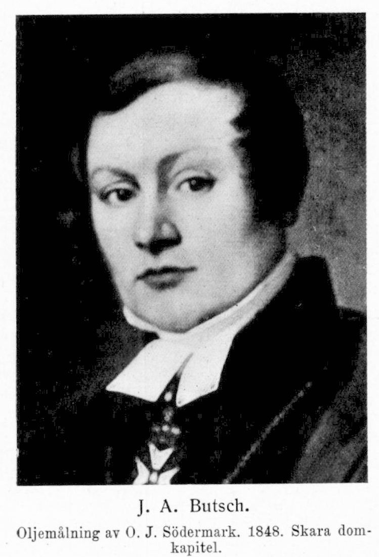 Butsch, Johan Albert, f. 6 febr. 1800 i Borås, d. 2 mars 1875 å Brunsbo biskopsgård. Föräldrar: färgaren Ambrosius Butsch och Ulrika Brink. Student i Uppsala 20 okt. 1815;. disp. 15 maj 1819 (De pietismo; pres. S. Lundblad); fil. kand. 20 dec. 1820; disp. 18 apr. 1821 (In Apollinem hymnus Homericus svethice redditus, p. 1; pres. J. O. Höijer); fil. magister 14 juni 1821; teol. kand. 15 juni 1824; prästvigd 10 juni 182?; disp. 26 maj 1832 (Historia dogmatis de satis-factione Jesu Christi vicaria inde ab Anselmo Cantuariensi ad Hugonem Grotium perducta, p. 1; pres. J. Thorsander); teol. lic. 15 juni 1832. Docent i teol. prenotioner och kyrkohistoria i Uppsala 27 juli 1824; tf. kalseniansk professor vt. 1826, ht. 1827–vt. 1829 samt. vt. 1835; uppförd på första förslagsrummet till samma professur 31 jan. 1829; tf. professor i dogmatik och moralteologi ht. 1829–vt. 1830, vt. 1833–ht. 1834 samt ht. 1835; e. o. teol. adjunkt 28 jan. 1830; uppförd på andra förslagsrummet till professor i pastoralteologi 3 dec. s. å. och på första förslagsrummet till andre teol. adjunkt 6 juni 1831; andre teol. adjunkt samt kyrkoherde i Börje prebendeförsamling 10 nov. 1832; medarbetare i Allmän ecclesiastiktidning s. å.–1833; adjungerad ledamot av Uppsala domkapitel flera gånger under 1833; förestod de kateketiska övningarna vt. 1833–vt. 1836; prost i Börje 8 jan. 1834; e. o. ledamot av Uppsala domkapitel 15 febr. 1834; uppförd på andra förslagsrummet till professor i dogmatik och moralteologi 16 juni 1835; förste teol. adjunkt 13 aug. s. å.; examinator i studentexamen ht. s. å. och delvis vt. 1836; kalseniansk professor 30 apr. 1836; kontraktsprost över Ulleråkers kontrakt 5 juni 1837; biskop i Skara 1 sept. s. å.; bevistade riksdagarna 1840–48, 1853–54 och 1859–63; beredde kronprinsen Karl, arvfurstarna och prinsessan Eugenie till deras första nattvardsgång; ordförande i kommittén angående nya predikotexter 6 juli 1849–3 aug. 1850; uppförd på andra förslagsrummet till ärkebiskop 22 dec. 1851; ordförande i kommittén angående ny kyrkohandbok och katekesförklaring 9 juli 1852 (avgav förslag till ny kyrkohandbok 1854, reviderat förslag till dylik 1 nov. 1855 och förslag till ny katekes 5 juni 1856. samt senare yttranden); uppförd på första förslagsrummet till ärkebiskop 14 nov. 1855 men avsade sig utnämningen; bevistade kyrkomötet 1868. LLA i egenskap av biskop 1837; LNO 1838; KNO 1842; KmstkNO. 1844; teol. doktor 1844, promoverad 14 juni 1845; fil. jubeldoktor 31 maj 1872.