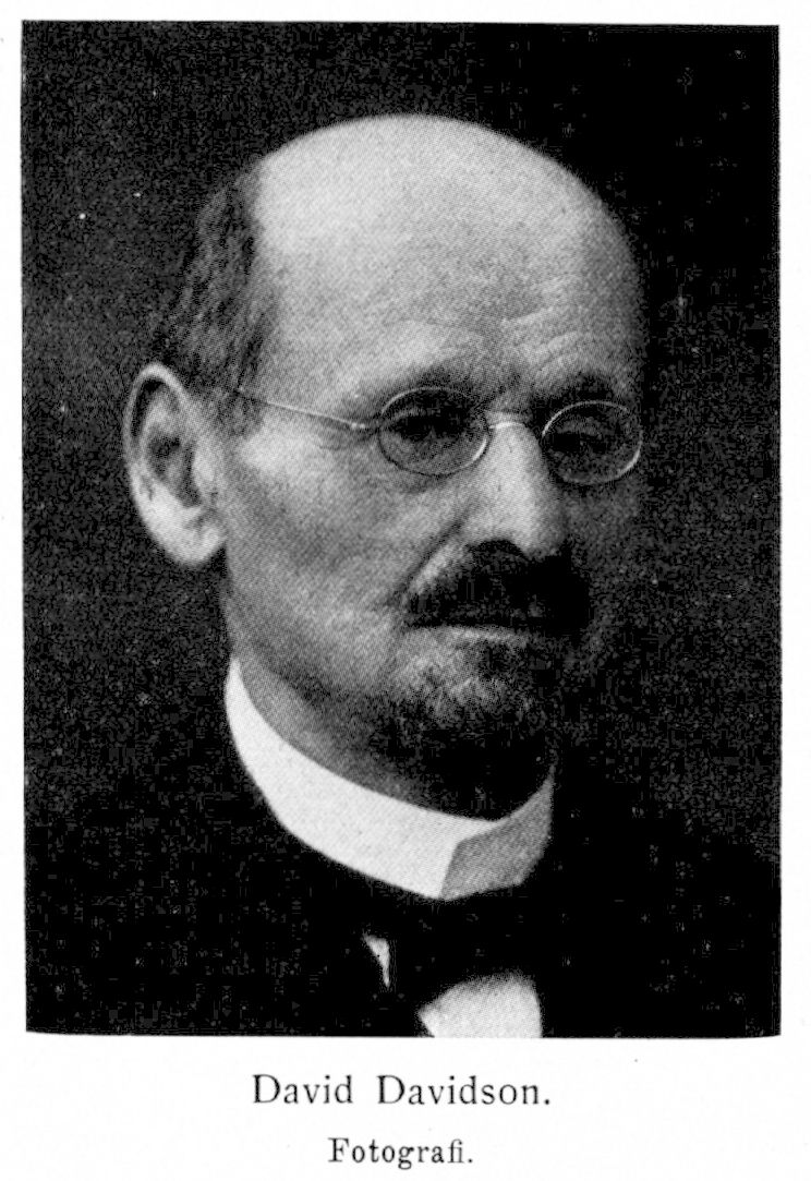 Davidson, David, f. 21 aug. 1854 i Stockholm. Föräldrar: handlanden Isak Isak Davidson och Rebecka Stiebel. Elev vid mosaiska församlingens i Stockholm skola 1861—vt. 1867 och vid Stockholms gymnasium ht. 1867;- avlade mogenhetsexamen vid sistnämnda läroverk 16 maj 1871; student vid Uppsala universitet 21 sept. 1871; jur. fil. kand. 6 apr. 1872; jur. utr. kand. 13 dec. 1877; har företagit studieresor till Heidelberg maj—dec. 1879 och med understöd av jur. fakulteten till universiteten i Berlin och Leipzig sommaren 1885. Lärare i kameralistik och ekonomisk rättskunskap vid Ultuna lantbruksinstitut ht. 1877—okt. 1889 samt sekreterare i institutets styrelse 1880—sept. 1889; e. o. notarie i Svea hovrätt 10 jan. 1878; docent i nationalekonomi vid Uppsala universitet 10 febr. 1879; jur. fakultetens stipendiat på tre år 5 juni 1880 och ånyo på tre år 14 apr. 1883 samt med fast stipendium från 1 apr. 1886; uppehöll undervisningen och examinationen i nationalekonomi ht. 1880—vt. 1888; sekreterare i sammansatta banko-och lagutskottet vid 1886 års riksdag; tf.professor ht. 1888 —ht. 1889, e. o. professor 31 dec. 1889 samt professor 24 apr. 1890 i nationalekonomi och finansrätt vid Uppsala universitet; erhöll i uppdrag att utarbeta en översikt av utländsk lagstiftning angående inkomstskatt 6 sept. 1892; redaktör för Ekonomisk tidskrift från 1899 (erhöll utgivningsbevis 4 jan. 1899); ledamot av kommittén angående inkomstskatt och obligatorisk självdeklaration 18 juni—15 okt. 1901; upprättade för universitetsexamenskommittén den statistiska utredningen beträffande universitetet i Uppsala 1903; deltog 1911 i bearbetning av försvarskommitténs betänkande av 5 dec. 1910 samt granskade därpå jämte I. Flodström dess finansiella utredning (bet. avg. 28 sept. 1911); revisor i Oxelösund— Flen—Västmanlands järnvägs-a.-b. från 1912; en av de sakkunniga angående statens och kommunernas skuldsättning 26 okt. 1912—dec. 1914; ledamot av kommittén angående förvaltningen av allmänna pensionsförsäkringsfonden 18 juni 1915—4 mars 1916; ordförande bland sakkunniga angående exportavgift för varor, som utföras från landet 21 dec. 1915—30 mars 1916; en av de sakkunniga angående sedelcirkulationens ökning och allmänna prisnivåns stegring m. m. 14 juni—30 juli 1918; ledamot av tull- och traktatkommittén 7 mars 1919—dec. 1922; erhöll 24 juli 1919 avsked från professuren som professor emeritus med pension från 16 sept. 1919; ledamot av 1920 års finanssakkunniga 30 apr.—14 maj 1920 och av inkomstskattesakkunniga 13 nov. 1920—28 sept. 1923; revisor i Örebro—Köpings järnvägs-a.-b. från 1924; sakkunnig angående pöst-sparbankens och de enskilda sparbankernas räntepolitik 15 mars— 3 dec. 1929. — Har avgivit sakkunnigutlåtanden angående e. o. professuren i speciell privaträtt i Uppsala, tillsatt 1898, e. o. professuren i nationalekonomi och finansrätt i Lund, tillsatt 1901 och 1919, e. o. professuren i nationalekonomi i Uppsala, tillsatt 1921, och professuren i nationalekonomi, och sociologi i Göteborg, tillsätt 1931. Hedersledamot av Stockholms nation i Uppsala 1885; jur. hedersdoktor vid Uppsala universitet 6 sept. 1893; RNO 1899; LHVS 1906; KNO2kl 1911; erhöll av Vetenskapsakademien Söderströmska medaljen i guld för förtjänster om nationalekonomisk forskning 1912; fil. hedersdoktor vid Uppsala universitet 31 okt. 1917; LVA 1920; KNO1kl 1928.
