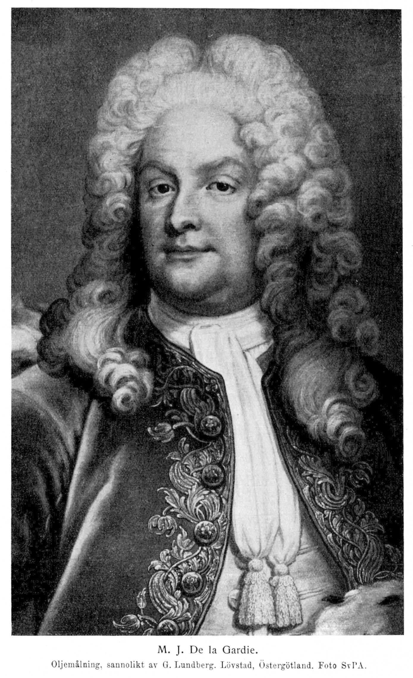 13. Magnus Julius De la Gardie, de trenne föregåendes kusin, son till D. 9, f. 14 apr. 1669, d 28 apr. 1741 i Stockholm. Greve till Tullgarn, friherre till Sjö, herre till ett betydande antal egendomar i olika delar av landet (se nedan). Gick omkr. 1690 troligen först i fransk och därpå under G. F. Lewenhaupt i venetiansk krigstjänst; kapten, överstelöjtnant 1703 samt slutligen (1705, 1707?) överste vid Förstenbergska regementet i fransk tjänst; överste för Dalregementet 28 sept. 1709 (med konfirmation 22 nov. 1710); generalmajor av infanteriet 27 mars 1713; deltog i riksdagarna 1713 och 1719 och var bl. a. ledamot av sekreta utskottet vid den senare; generallöjtnant av infanteriet 16 jan. 1717; kallades av drottningen till riksråd 30 dec. 1718 men tillträdde först efter erhållen ny fullmakt 7 maj 1719; krigsråd 28 apr. 1719; rikskansliråd 15 maj 1719; president i kommerskollegiet 4 juni 1719— 3 aug. 1727; kommissarie vid förhandlingarna med England och Hannover 7 juli 1719 (preliminär-konvention med England 18/29 aug. 1719); ledamot av kommissionen i Linköping angående allmogens i Östergötland förräderi vid fiendens infall 5 aug.—9 sept. 1719; kommissarie vid fredsförhandlingarna med Hannover 2 nov. 1719 och med Preussen 15 dec. 1719, vid förhandlingarna om defensivallians med England 15 dec. 1719, vid förhandlingarna om ersättning för av svenskarna tagna holländska skepp 8 apr. 1720 samt vid fredsförhandlingarna med Danmark 22 apr. 1720; ledamot av kommissionen angående försvarsverket till lands och sjöss för år 1721 (defensionskommissionen) 15 aug.—23 nov. 1720, av kommissionen angående expeditionen till Madagaskar 25 maj 1721— 14 dec. 1722, av kommissionen angående Finlands besättande efter fredsslutet 4 sept.—8 dec. 1721, av kommissionen angående de hemkomna officerarnas placering (krigskommissionen) 29 maj 1722 —25 okt. 1723, av kommissionen angående försvarsverket till lands och sjöss (defensionskommissionen)' 26 aug. 1723—10 febr. 1725, av kommissioneli för inventering och delning av änkedrottningens efterlämnade arvskap emellan drottningen och hertig Karl Fredrik av Holstein 27 apr. 1724, av kommissionen till statsverkets överseende (deliberationskommissionen) 13 juli 1724 (utrikes registr. fol. 604 v.) och av kommissionen angående lanthushållningens förbättrande (ekonomikommissionen) 8 juni 1725—3 dec. 1730; kommissarie vid förhandlingarna med ryske ambassadören V. Dolgo-rukij 20 dec. 1726 samt vid förhandlingarna om Sveriges accession till hannoveranska alliansen 23 jan. 1727; överstemarskalk 3 aug. 1727; konstituerad att deltaga i överläggningar med krigskollegiet angående vapen- och ammunitionsförråden samt armémagasinen 17 nov. 1727; ledamot av deputationen angående kolonisation av ön Parima i Västindien jan.—8 okt. 1728; kommissarie för konferens med franske ambassadören S: t Severin d'Aragon 23 okt. 1738 och vid förhandlingar om subsidiekonvention mellan Sverige och Frankrike 28 okt. 1738; ledamot av sekreta kommissionen angående försvarsverket nov. 1739—29 febr. 1740.