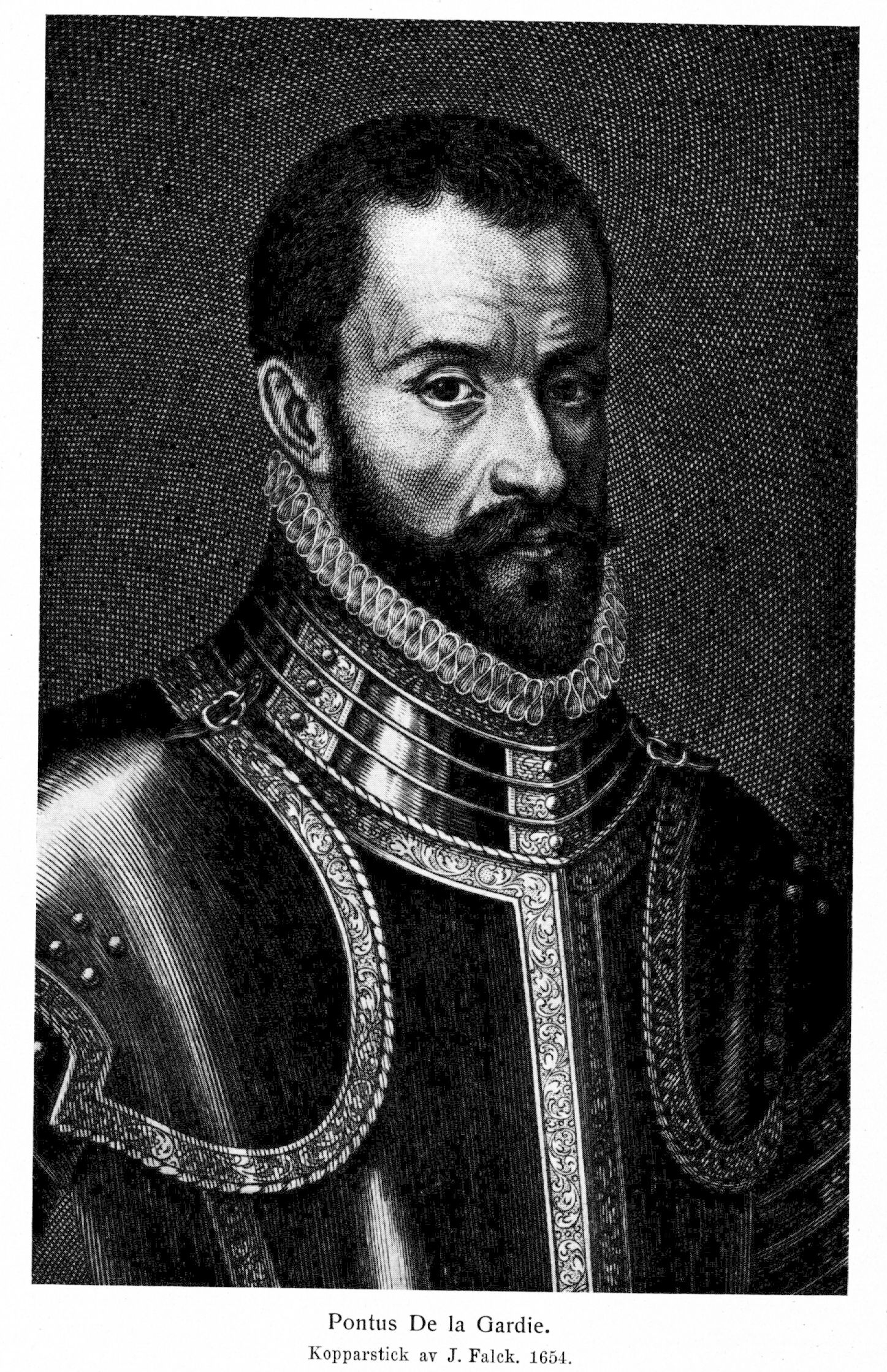 1. Pontus De la Gardie, f. (enl. vanlig uppgift) 1520, d 5 nov. 1585 genom drunkning i Narovafloden. Fader: köpmannen Jacques Scoperier i Caunes, Languedoc, Frankrike.[1] Studerade i Bologna och var munk i ett franskt kloster; övergick till krigstjänst och stred i Piemont och Flandern samt sedan i Skottland, dit han följde franska trupper, som skulle stödja änkedrottning Maria mot hennes upproriska undersåtar; tog efter fördraget i Edinburgh 1560 anställning med franska och skotska legosoldater i Danmark; tillfångatogs av svenskarna vid Varbergs erövring 28 aug. 1565; övergick i svensk tjänst; sändes jämte Joakim Grip till Frankrike för att värva krigsfolk 1566 (instr. 30 maj); omtalas som hertig Johans hovmästare 1568; förordnades till drottning Katarina Jagellonicas hovmästare 1569 (namnes hovmästare även 1573 och hovmarsk 1576); slagen till riddare vid Johan III: s kröning 10 juli 1569; tjänstgjorde som en av hertig Karls underbefälhavare vid infallet i Skåne okt. 1569; tillfångatogs av danskarna dec. 1569, frigavs 16 mars 1571; friherre 27 juli 1571 med Ekholmen i Uppland som friherreskap; erhöll K. brev om vapenförbättring 6 okt. 1571; sändebud, jämte hovjunkaren Klas Bielke, till Tyskland, Nederländerna och Frankrike 6 okt. 1571 och synes ej hava hemkommit förrän sept, 1572; insattes i slottsloven å Stockholms slott 15 apr. 1573; erhöll fullmakt att i Finland uppbära smörräntan m. m. att därmed betala, krigsfolket i Estland 30 sept. 1573; erhöll fullmakt att som kommissarie, jämte Hans Kyle och Erik Gabrielsson Oxenstierna, underhandla med det tyska krigsfolket i Estland och betala detsamma 13 okt. 1573; har tydligen också fått i uppdrag att övertaga befälet över trupperna där närmast under guvernören; fick åläggande att tills vidare hava inseende med Revals fästning och allt annat i Estland 19 apr. 1574; erhöll fullmakt att vara fältöverste i Lifland (Estland) 6 sept. 1574; häradshövding i Trögds härad 8 maj 1575; kallas 12 febr. 1575 »ståthållare och krigsöverste i Lifland» och skriver sig själv så 10 mars 1575; erhöll fullmakt att hava översta befallningen på Revals slott och i Estland 16 juni 1575; kallas 1576 och flera följande år hovråd; sändebud till Italien 1576 (kreditiv för D. och Petrus Michaelis Fecht av drottning Katarina 16 aug. och av Johan III 17 aug. samt av Johan III som sändebud till påven 18 aug.; kreditiv för D. som sändebud till kejsaren 18 aug.); fältöverste i Finland 25 aug. 1580; erhöll jämte Herman Fleming, Göran Boije och Karl Henriksson Horn instruktion angående krigets förande 18 juni 1581; erhöll fullmakt att vara överste ståthållare i Lifland (Estland) 5 juli 1581, vilket ämbete han sedan innehade till sin död; erhöll kreditiv 4 juli 1582 att, jämte Gustav Baner, underhandla med hertig Karl angående stadgan om kungliga och furstliga rättigheterna; erhöll fullmakt att allena hava översta befallningen vid K. M:ts krigsmakt 22 okt. 1582; förordnad att vara en av kommissarierna vid fredsunderhandlingarna med ryssarna vid Pliusa 1 juli 1583; var ännu icke riksråd 18 aug. 1583 men tjänstgör som sådant mars 1585; utsedd att vara en av kommissarierna vid de nya fredsunderhandlingarna med ryssarna 1585 (instr. 16 juli) och kallas då riksråd, krigsöverste och ståthållare i Lifland (Estland) och Ingermanland. — Erhöll 1569 förläning på Ekholmens gård jämte Veckholms och Hacksta socknar i Trögds härad, vilken förläning ökades med Boglösa och Lillkyrka socknar 30 juli 1571 och från 27 juli 1571 utgjorde huvudstommen i hans friherreskap (Ekholmen), som dessutom omfattade en stor mängd gårdar inom nästan alla socknar i Trögds härad; förlänades 30 juli 1571 med Sundby (Västra Ryd, Bro härad), där han redan 1572 byggt sätesgård; förlänades med Limingo socken i Finland 11 sept. 1576 (konfirmation 1580) och med Runsa i Eds socken, Sollentuna härad, 22 aug. 1580; erhöll Kolk (Harriens krets, Estland) som evärdlig possession för sig och sina efterkommande 13 juni 1581; erhöll Kechtel i Rappels socken (Harriens krets, Estland) som evärdlig possession 10 maj 1585; ägde i Stockholm redan 1576 ett hus på Svartmangatan, som ingick i Sofia Gyllenhielms morgongåva 1580 (tomten Svartmangatan 6, kv. Ceres n:o 13; huset synes delvis genom arv från D. ha kommit till dottern Brita och hennes make Jesper Mattsson Kruus, vilkas initialer sitta å fasaden); innehade.även en malmgård i Stockholm.