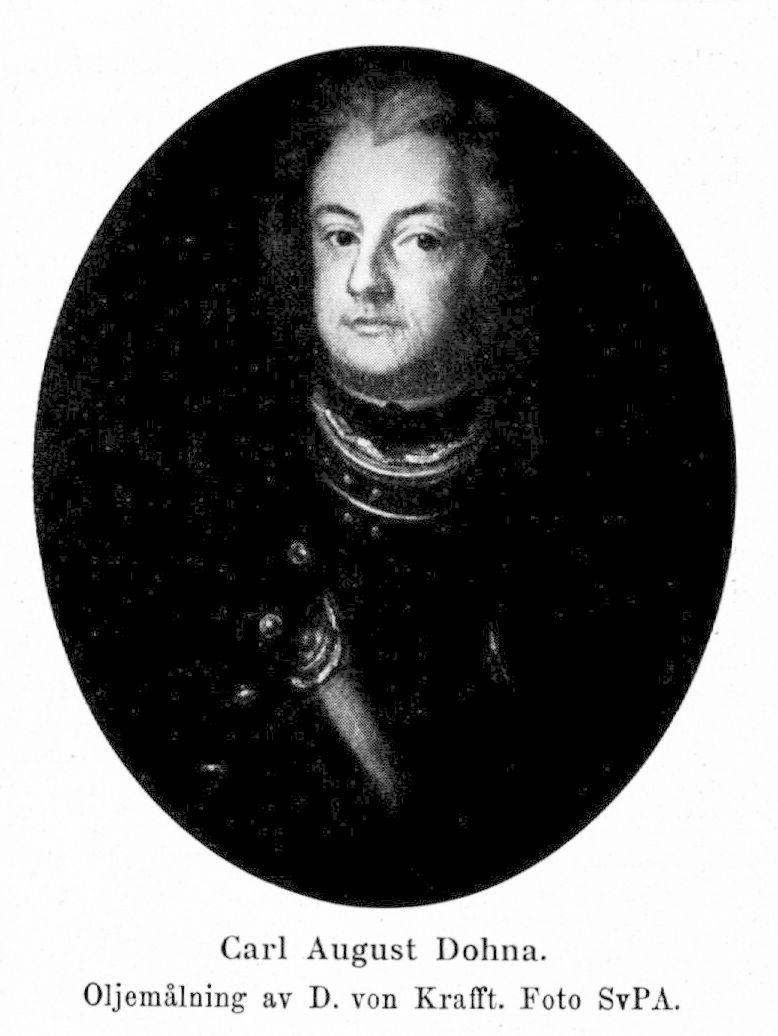 3. Carl August Dohna, son till D. 2, f. 18 (28) dec. 1691 i Königsberg, d. 10 jan. 1744 i Stockholm. Adjutant vid Alt-Dohniska infanterireg. i Ostpreussen 1704; kapten vid Bulows dragonreg. i hannoveransk tjänst febr. 1705—06; premiärkornett i svensk tjänst vid Bremiska dragonreg. juli 1706; löjtnant där 8 sept. 1709; ryttmästare där 22 sept. 1710; ryttmästare vid Västgöta tre- och femmänningskavallerireg. 11 mars 1711; ryttmästare vid Livreg. till häst 6 juni s. å.; kapten vid Livgardet till fot 10 nov. s. å.; generaladjutant av flygeln 30 aug. 1718; löjtnant vid Livdrabanterna till häst 18 juni 1719; överste för Garnisonsreg. i Stralsund och kommendant där 28 juni 1728; kaptenlöjtnant vid Livdrabantkåren och generalmajor av kavalleriet 13 sept. 1737; avsked 1740; deltog på Riddarhuset i riksdagarna fr. o. m. 1720 t. o. m. 1742—43 och var därunder medlem av justitiedeputationen 1723 och 1726— 1727 samt av sekreta utskottet 1742—43; led. av krigsrätten för undersökning av olyckorna i ryska kriget 1742—43.