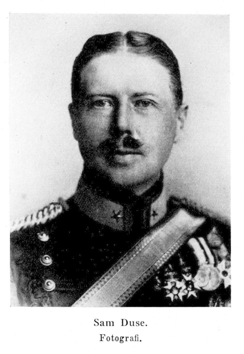 Samuel August Duse, f. 2 aug. 1873 i Stockholm (Tysk.), d. 9 febr. 1933 i Stockholm (Hedv. EL). Föräldrar: kammarjunkaren Carl Patrik Theodard Duse och Anna Mathilda Forssberg, Mogenhetsex. vid h. realläroverket på Norrmalm, Stockholm, 17 maj 1892; volontär vid Livgardet till häst 20 maj s. å.; sergeant där 6 juni 1893; elev vid krigsskolan 1 aug. s. å.; utexaminerad 5 nov. 1894; underlöjtnant vid nämnda reg. 23 nov. s. å., vid Norrlands artillerireg. 28 sept. 1895; utexaminerad från artilleri- och ingenjörhögskolans allm. kurs 24 maj 1898; löjtnant vid sistnämnda reg. 3 juni s. å.; utexaminerad från nämnda högskolas h. kurs 15 maj 1900; deltog som kartograf, meteorolog och hydrograf i svenska sydpolarexpeditionen 16 okt. 1901—10 jan. 1904; kapten vid reg. 26 mars 1904; major vid Svea artillerireg. 28 mars 1917; major på överg:stat 1 nov. 1926, i res. 9 aug. 1928. Författare och konstnär (målare och skulptör); ordf. i Travellers' Club 1922—27 och i Konstnärsringen i Stockholm 1925—28; RVO 1906; RSO 1915; innehade även utländska ordnar och svenska medaljer.