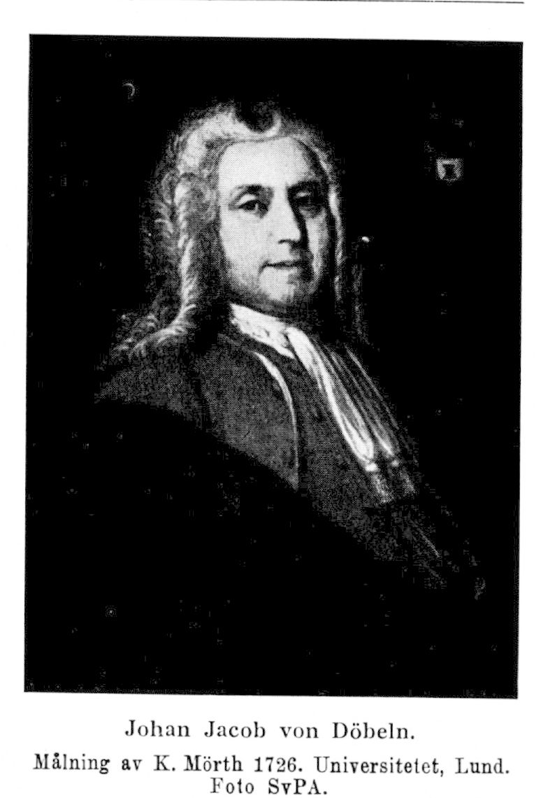 1. Johan Jacob von Döbeln, före adlandet Döbelius, f. 29 mars 1674 i Rostock, d. 14 jan. 1743 i Lund. Föräldrar: med. doktorn, professorn i Rostock Johannes Jacobus Döbelius och Anna Elisabeth von Hillen. Student i Rostock 7 april 1690; studerade medicin i Köpenhamn, Königsberg, Danzig och Leiden; livmedikus hos polska starosten Grudzinski 1693; med. doktor i Rostock 18 april 1695; provinsialmedikus i Göteborgs och Bohus län samt stads-fysikus i Göteborg 31 maj 1697; assessor i Collegium medicum s. å.; provinsialmedikus i Skåne 17 mars 1699; stabsmedikus vid svenska armén i Skåne 3 dec. 1709; professor i medicin vid Lunds univ. 14 mars 1710; dess rektor magnificus 1717, 1729, 1742; adlad 21 jan. 1717. LVS 1733; led. av kejserliga tyska Academia naturse curiosorum 1736.