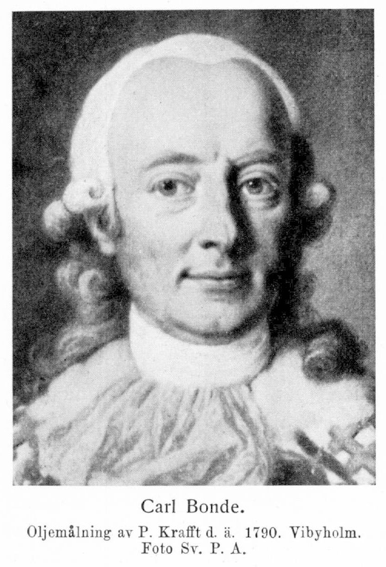 11. Carl Bonde, son av B. 9 i hans andra gifte, f. 11 sept. 1741 på Hässelby, Spånga socken, d 4 aug. 1791 på Sävstaholm. Greve till Björnö, herre till Bordsjö, Katrineholm, Hästeryd, Kunhult, Sävstaholm och Vibyholm. Student i Uppsala okt. 1754, vistades där till 27 okt. 1756 och ånyo från 15 okt. 1757 till 11 maj 1758. E. o. kanslist vid kanslikollegium 20 jan. 1757; erhöll kammarherres titel 3 mars s. å.; avlade examen i kanslikollegiet 24 mars s. å.; tjänstgjorde från hösten 1759; e. o. kanslijunkare 12 febr. 1760; auskultant i Svea hovrätt 23 apr. 1761; kommissionssekreterare vid polska och kursachsiska hoven 23 nov. 1762; kommissionssekreterare vid engelska hovet 31 jan. 1764; företog resor i England, Frankrike, Italien, Österrike och Tyskland juli 1767 till aug, 1768, då han återvände till Sverige; erhöll på egen begäran entledigande från kommissionssekreterarbefattningen vid engelska hovet 7 mars 1769; tjänstgörande kammarherre hos drottningen 9 dec. s. å.; hovmarskalk och överkammarherre hos prinsessan Sofia Albertina 24 sept. 1770; ledamot av övre borgrätten 8 jan. 1771; president i Vasa hovrätt 18 jan. 1781; en av rikets herrar 1 sept. 1782; riksråd 16 maj 1788; riksmarskalk 17 maj s. å.; behöll jämte K. A. Trolle-Wachtmeister och Fr. V. von Hessenstein riksrådstiteln vid riksrådets upphävande 1789; ledamot av Högsta domstolen 15 maj s. å.; medlem av tillförordnade regeringen 1789 och 1791. KNO 1785; RoKavKMO s. å.