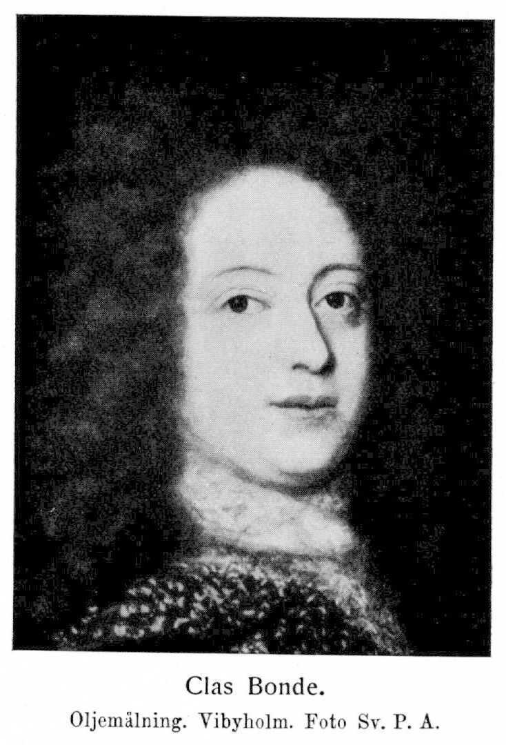 8. Clas Bonde, den föregåendes syssling, f. 27 nov. 1664 på Vaholm i Västergötland, d 23 apr. 1726 på Sävstaholm. Föräldrar: lantdomaren i Skåne Ulf Bonde och Kristina Bielkenstierna. Greve till Sävstaholm (1719), friherre till Vaholm, herre till Ör, Åkeshov, Johannislund, Bergkvara, Nygård, Gäddeberg och Ulfängen. Studerade i Lund; inskriven vid Uppsala universitet 20 mars 1679; företog en utrikes resa 1688−91. Började efter sin hemkomst till Sverige 1691 auskultera i riksarkivet; kammarherre hos prinsessan Ulrika Eleonora 15 okt. 1697; landshövding i Blekinge 23 maj 1713 (genom fullmakt daterad i Timurtasch); riksråd genom drottningens vokation 30 dec. 1718 och ständernas förslag 7 apr. 1719; upphöjd i grevligt stånd 17 apr. 1719; rikskammarråd 28 apr. s. å.; preses i den av K. M:t förordnade kommissionen över upphandlingsdeputationen 22 maj s. å. samt i den av nämnda kommission och en av ständerna över samma ärende förordnad kommission sammansatta kommissionen 8 juni s. å.; erhöll avsked från rikskammarrådsbefattningen 11 okt. 1720.