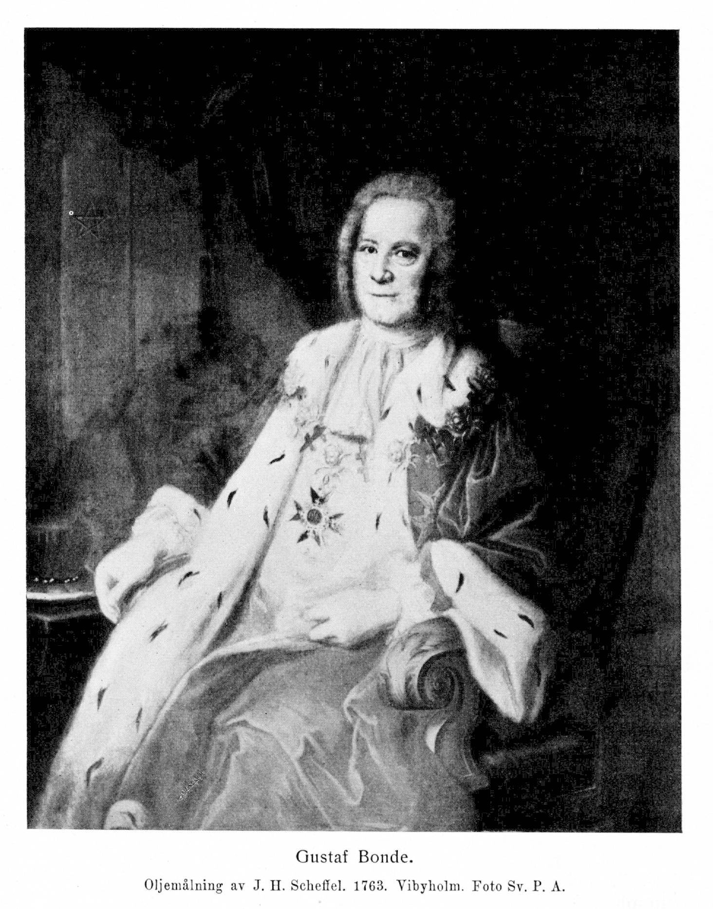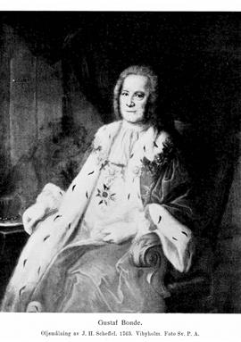 9. Gustaf Bonde, son till B. 7 i hans första gifte, f. 6 apr. 1682 i Stockholm, d 5 dec. 1764 därstädes. Greve till Björnö, herre till Bordsjö, Katrineholm, Hästeryd, Hässelby och Mällingsholm. Student vid Åbo universitet 25 nov. 1695; medföljde fadern på dennes ambassad till Holland och England 1697—98; kornett vid Upplands ståndsdragoner 1 okt. 1700 (konfirmationsfullmakt 25 okt. s. å.); erhöll avsked utan att ha inträtt i tjänstgöring 1701; student i Tübingen 1702; disp. därstädes 23 apr. 1703 (Statera universalis...; pres. J. C. Creiling); reste i Österrike, Italien, Frankrike och Holland 1703−05. Kammarherre hos änkedrottning Hedvig Eleonora 1705; deltog i utskottsmötet 1710 och i ett flertal följande riksdagar samt var därunder bl. a. ledamot av sekreta utskottet 1710, 1713−14, 1719, 1720 och 1726−27, ordförande i fredsdeputationerna 1713−14, 1719 och 1720 samt ledamot av sekreta deputationen 1723; kommerseråd 28 okt. 1711; ledamot i undersökningskommissionen angående administratorn av Holstein Kristian Augusts förvaltning 1716; landshövding i Östergötland 29 juli 1718; ordförande i deputationen över ständernas kontor 10 maj 1720; president i bergskollegiet 9 jan. 1721; ordförande i riksens ständers kommission över J. Fr. Osthoff. 11 okt. 1723−18 jan. 1724; ledamot av riksens ständers kommission för överseende av kyrkolagen 16 okt. 1723; ordförande i kommissionen för rannsakning rörande religiösa sammankomster i Sickla 23 okt. s. å., i östra kommissionen för överseende av Finlands hushållning 17 nov. 1724 (instruktion 8 dec.) och i riksens ständers kommission över Maurits Vellingk 12 nov. 1726; riksråd 8 juli 1727; ledamot av riksens ständers kommission över amiralitets- och försvarsverket 4 aug. s. å.; ledamot av deputationen angående kolonisation av ön Parima i Västindien 1728 (sammanträdde 2 jan., bet. 8 okt.) och av deputationen för granskning av landshövding G. Palmfelts och kommerserådet Jakob von Hökerstedts projekt rörande statsbristens fyllande 15 apr. 1730; rikskansliråd 29 mars 1731; ledamot av deputationen för överseende av 1733 års förordning om mått och vikt 15 mars 1737 och av sekreta kommissionen angående försvarsverket i Finland maj s. å.; kansler för Uppsala universitet 24 nov. s. å.; erhöll avsked från riksråds-, rikskansliråds- och kanslersämbetena 26 mars 1739; erhöll inseende över antikvitetsarkivet 19 jan. 1757; kallad att återinträda i rådet 14 dec. 1761. Hederspresident i Societas regia literaria et scientiarum Upsaliensis 1735; KNO 1748; RoKavKMO s. å.; LVA s. å. (pres. 1755); LHA 1754.