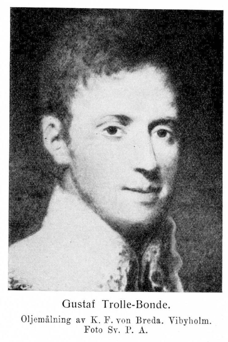 13. Gustaf Trolle-Bonde, son till B. 11, f. 28 mars 1773 på Vibyholm i Årdala socken, d 3 jan. 1855 i Stockholm. Innehade Sävstaholm, Bordsjö, Katrineholm, Härrestad, Askeryd, Trolleholm, Björnö och Hässelby samt erhöll såsom innehavare av Trolleholms fideikommiss K. M:ts tillstånd att kalla och skriva sig Trolle-Bonde 16 maj 1809. Student vid Uppsala universitet 2 mars 1790−92; kammarherre hos drottningen 1800; hovmarskalk 1816; överstekammarjunkare 1823; en av rikets herrar med titeln excellens 11 maj 1826. RNO 1816; Kmst-KNO 1823; LSkS 1830; Hed-LFrKA 1835; HedLLA 1843; LMA 1851; LVA 1852; Hed-LVS s. å.; HedLHA 1853.
