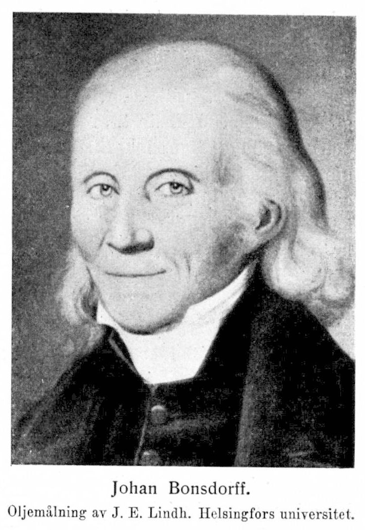 3. Johan Bonsdorff, de båda föregåendes broder, f. 1 apr. 1772 i Borgå, d 8 juli 1840 i Kakskerta. Student i Åbo 30 jan. 1788; disp. 10 juni 1791 (Diss. sistens theoriam mentis human» revelatione excultæ, p. I; pres. J. Bonsdorff); fil. kand. 16 mars 1792; disp. 16 juni s. å. (De scepticismo historico, p. I; pres. H. G. Porthan); fil. magister 22 juni s. å.; student i Uppsala 12 okt. 1792. Docent i orientaliska språk vid Åbo universitet 13 febr. 1794; amanuens i akademiska konsistoriet ldec. 1795; adjunkt i fil. fakulteten 15 juli 1800; universitetets bibliotekarie 23 febr. 1802; föreläste i pedagogik och didaktik 1803−07; professor i orientaliska språk och grekiska 1 juni 1807 och efter professurens delning endast i grekiska. 2 juli 1812; tjänstledig mot sin egen vilja 25 mars 1823; erhöll avsked som emeritus 16 maj 1832.