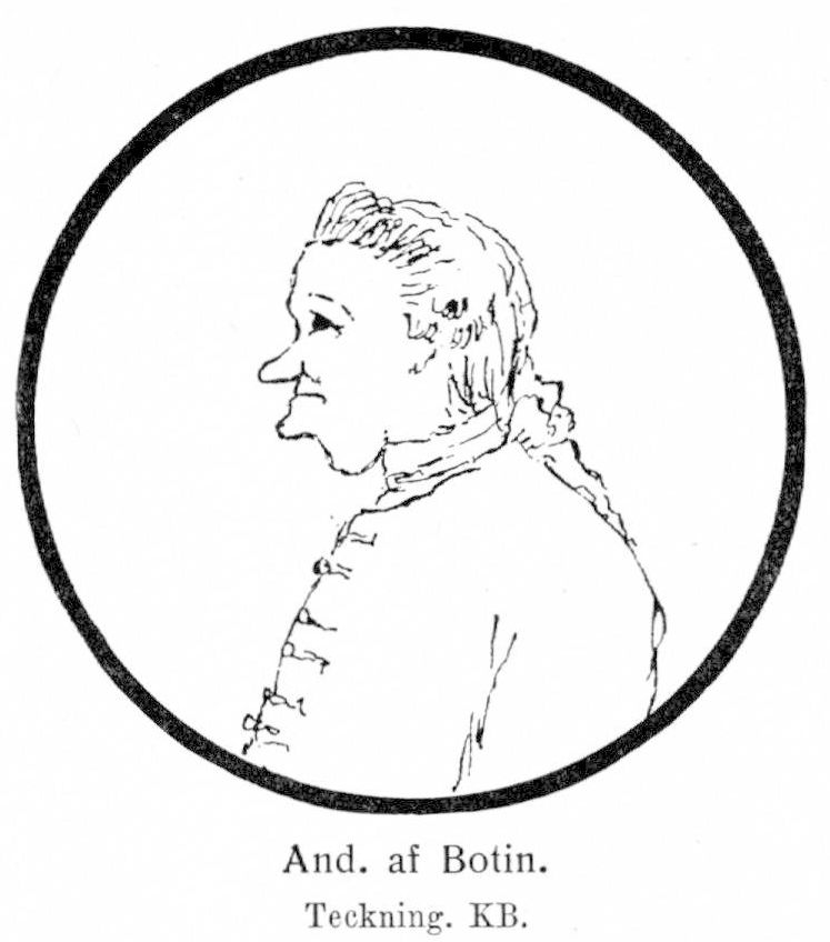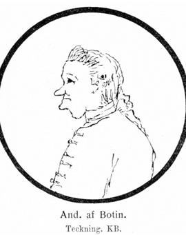 Botin, Anders af, före adlandet Botin, f. 15 mars 1724 i Hagby, Kalmar län, d 22 sept. 1790 i Stockholm. Föräldrar: kronofogden Hans Botin och Anna Moring. Erhöll enskild undervisning i hemmet: student i Uppsala 28 sept. 1744; erhöll testimonium academicum 22 sept. 1748. Auskultant i Svea hovrätt 1 okt. 1748; e. o. kanslist i riksarkivet 31 okt. 1751 (ed 2 nov. s. å.); e. o. assessor i antikvitetsarkivet 20 okt. 1756 (jmfr ständernas skrivelse 7 okt. s. å.); ledamot av kommissionen angående kammarverkets förbättring (jordeböckernas förkortande) 27 apr. 1757−1766; assessor i antikvitetsarkivet 8 mars 1758; uppfördes på förslag till rikshistoriograf 20 maj 1760; kammarråd 29 juni 1762; adlad 1767 (enligt koncept i RA 24 nov., enligt avskrift på riddarhuset 24 jan.) men adelsbrevet blev ej utfärdat, varför det blev bekräftat 22 apr. 1776; ledamot av kommissionen till drätselverkets överseende 10 apr. 1770−4 mars 1771; ledamot av beredningen för införandet av genuesiska lotteriet 24 sept. 1770−19 jan. 1771; ledamot av direktionen för nummerlotteriet 15 mars 1771−nov. 1787; ledamot av lanthushållningskommissionen 23 mars 1772−26 sept. 1780; ledamot av finanskommissionen 1772; kronofullmäktig i direktionen för generalassistanskontoret 2 nov. 1772−1775; ledamot av skogs- och jägerikommissionen 15 febr. 1773−23 febr. 1787; deltog i lagkommissionens arbete angående storskiftes- och ägodelningsförordning för Finland 1773 och rörande arrende och lagfart 1775; ledamot av bankorevisionen 1785. LVA 1770; LHA 1773; RNO 1775; en av de aderton i Sv. Akad. 1786. — Ogift.