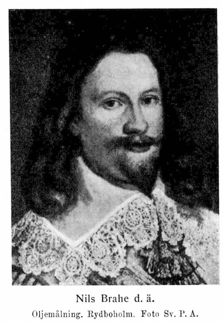 9. Nils Brahe d. ä., broder till B. 7 och 8, f. 14 okt. 1604 på Rydboholm, d 21 nov. 1632 i Naumburg i Tyskland. Greve till Visingsborg, friherre till Rydboholm och Lindholmen, herre till Sesswegen. K. page 31 aug. 1620; student vid universitetet i Leyden 11 dec. 1623−1624. Kammarjunkare 1625; fänrik vid von Thurns kompani av hovregementet före nov. s. å; deltog i Gustav Adolfs preussiska fälttåg 1626−27; kapten nov. 1626; överstelöjtnant 1627; av konungen slagen till riddare 23 dec. s. å; förordnad att anställa sammanräkning av det i hemlandet disponibla krigsfolket 21 jan. 1628; överste för Upplands fotfolk 17 mars s. å.; skickades med åtta kompanier av sitt regemente till Preussen våren s. å.; deltog i undsättningsexpeditionen till Stralsund från juli s. å.; återvände till Sverige hösten 1629; följde Gustav Adolf till Tyskland sommaren 1630; erhöll fullmakt att värva ett regemente fotfolk 11 okt. s. å.; överste för livregementet och chef för K. M:ts livgarde (vilka tillsammans bildade gula regementet eller brigaden) 1631; general av infanteriet 1632.