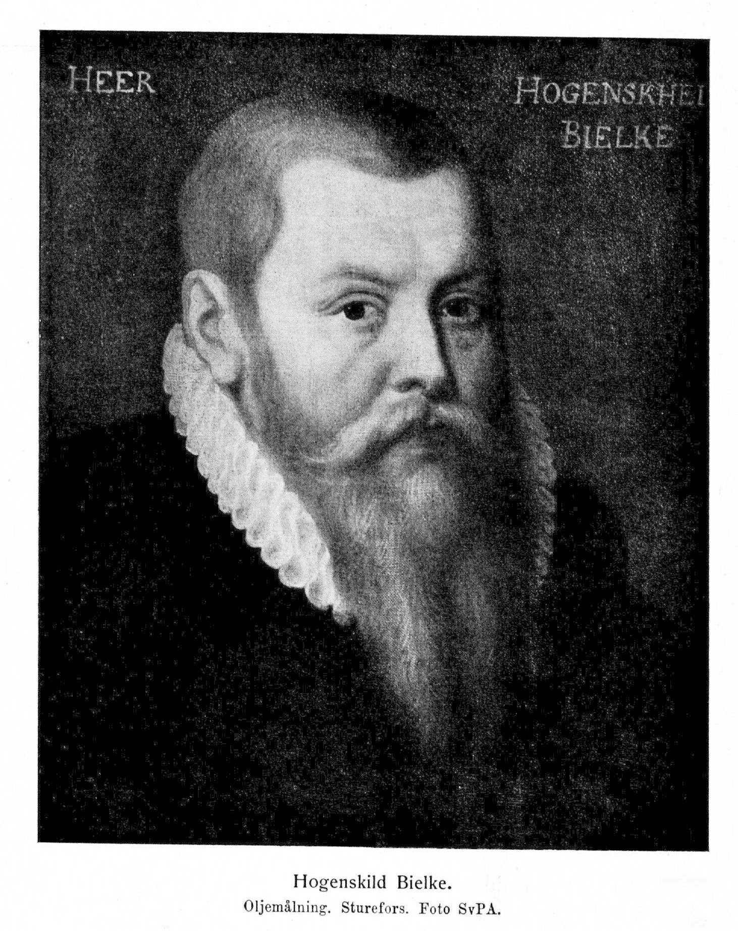 17. Hogenskild Bielke, son till B. 15, f. 1538 på Stora Dala i Västergötland, avrättad 3 juni 1605 i Stockholm. Studerade vid Åbo latinskola 1547—50, vid universitetet i Wittenberg 1551 samt vid Odense latinskola 1554—55. Hovsven hos hertig Magnus 1556, hos Gustav I 1557 och hos hertig Erik 1558; köksmästare hos den sistnämnde 1559; bevistade riksdagarna i Stockholm 1560, i Arboga och i Uppsala 1561; riddare 29 juni s. å.; bevistade herredagen i Jönköping s. å.; riksråd 1562; bevistade herredagen i Uppsala s. å.; sändebud till koadjutorn i Riga, hertig Kristoffer av Mecklenburg, 8 mars 1563 (instruktion); bevistade riksdagen i Stockholm s. å.; avfärdades till hertig Johan 13 juni och till hertig Magnus 6 okt. s. å. (instruktioner); bevistade riksdagen i Uppsala 1564; förrättade räfsteting i Finland och Västerbotten enligt brev 12 febr. s. å.; deltog i danska kriget 1565; kommendant på Varbergs slott 25 sept. 1566; fältöverste i Småland samt Öster- och Västergötland 5 nov. 1567; tillfångatagen av danskarna jan. 1568; utväxlad 18 dec. a. å.; bevistade riksdagarna i Stockholm och i Uppsala 1569; friherre s. å.; rådsherre hos hertig Karl s. å.; slottsloven i Stockholm 1570; ledde stora skeppsflottans utrustning s. å.; bevistade riksdagen i Stockholm 1571; sändebud vid utväxlingen av fredstraktaterna med Danmark i Knäred 12 mars s. å. (kreditiv 28 febr. s. å.), vid gränsmöte med danskarna i Avaskär 25 mars 1572 (instruktion), till Polen 6 aug. s. å. (instruktion); avfärdades till hertig Karl 24 febr. 1574 (fullmakt); bevistade riksdagen i Stockholm s. å.; medlem av domstolen över Karl de Mornay s. å.; bevistade herredagen i Stockholm 1575; sändes till hertig Karl 16 mars s. å. (kreditiv); bevistade herredagen i Stockholm 1576; ståthållare över Östergötland 19 dec. 1576 (fullmakt); lagman över Uppland och Norrland 18 apr. 1577 (fullmakt); bevistade herredagen i Vadstena 1580; avfärdades till hertig Karl 11 mars 1580 (instruktion); bevistade prästmötet i Linköping s. å.; sändebud vid gränsmöte med danskarna i Sjöryd 29 aug. s. å. (fullmakt); bevistade riksdagen i Stockholm 1582, herredagen i Västerås 1585, riksdagen i Vadstena 1587 och mötet i Kalmar s. å. samt rådsmötet i Uppsala 1589; ståthållare över Stockholm, Uppland, Västmanland och Norrland s. å.; i konungens onåd 1590—92; bevistade Uppsala möte 1593, riksdagen i Uppsala 1594, herredagen i Stockholm s. å., rådsmötet i Stockholm 1595, riksdagen i Söderköping s. å., rådsmötet i Vadstena s. å. samt riksdagen i Vadstena 1598; insatt i fängelse i Vadstena 1599; anklagad inför ständerna i Linköping 1600; vistades i fängelse på Gripsholm 1600–1605; anklagad inför ständerna i Stockholm 1605 och dömd till döden 4 maj s. å.