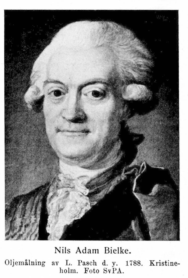 30. Nils Adam Bielke, son till B. 27, f. 30 jan. 1724 i Gröteborg, d 20 juni 1792 på Sturefors, Vists socken i Östergötland. Vistades på Krageholm i Skåne 1727–33; student i Lund 3 nov. 1733, i Uppsala 12 okt. 1738, ånyo i Lund ht. 1739–vt. 1741 och vid Greifswalds universitet ht. 1741—vt. 1743. Erhöll kammarherrefullmakt 28 jan. 1738, tillträdde hösten 1743; medföljde beskickningen till Hamburg, som hade att avhämta Adolf Fredrik, hösten s. å.; e. o. kanslist i kanslikollegiet 11 nov. s. å.; tjg. kammarherre hos kronprinsen och kronprinsessan hösten 1744; auskultant i Svea hovrätt 1746 (ed 27 nov.); sänd till Petersburg att notificera kronprins Gustavs födelse s.å. (instr. 14 jan.); ständig uppvaktande hos prinsen våren 1748; underguvernör hos honom 11 juni 1752; erhöll därjämte hovmarskalks heder och rang s. d.; bibehöll underguvernörslönen som pension, sedan sysslan 1756 indragits; hovmarskalk hos drottningen 1756; landshövding i Nyköpings län 4 aug. 1761; riksråd 5 maj 1769; överste marskalk vid hovet 27 maj s. å.; licentierad från riksrådsämbetet genom riksens ständers brev 4 maj 1772; intog ånyo säte i riksrådet 8 sept. s. å. (rådsprot.); tf. riksmarskalk hos drottningen under konungens resa 6 nov. 1772 (rådsprot.); ordförande i bränneridirektionen 14 sept. 1775–1782; president i bergskollegiet 1 sept. 1782; erhöll avsked från sina ämbeten 5 maj 1789. RNO 1754; KNO 1764; RoKavKMO 1769; LMA 1771; LVA 1774 (preses 1776 och 1785); LFrKA 1778.