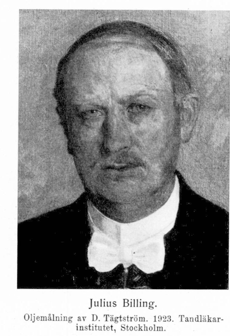 Billing, Anders Julius, f. 3 juli 1857 i Kristianstad. Föräldrar: murargesällen Per Ohlson Billing och Maria åkesdotter. Genomgick Kristianstads folkskola och h. allmänna läroverk; avlade mogenhetsexamen 4 juni 1877; student vid Lunds universitet 3 sept. s. å. och idkade därstädes studier för fil. kand.-examen, vilka dock på grund av ekonomiska svårigheter måste avbrytas; övergick efter någon tids annan verksamhet till tandläkarbanan 1888 och avlade tandläkarexamen i Stockholm 7 jan. 1891. Legitimerad tandläkare 12 jan. 1891; praktiserade i Kristianstad och Malmö; förordnades hösten 1904 att sköta lärarbefattningen i proteslära och tandreglering vid tandläkarinstitutet; ordinarie innehavare av samma befattning 13 apr. 1905; medlem av arméförvaltningens sjukvårdsstyrelses vetenskapliga råd 12 apr. 1918 och av medicinalstyrelsens vetenskapliga råd 1919–21; ordförande och sekreterare i Södra Sveriges tandläkareförening och Skånska tandläkaresällskapet; redaktör för Svensk tandläkaretidskrift jan. 1919–juni 1920; tilldelad professors namn, heder och värdighet 23 maj 1919; erhöll avsked från lärarbefattningen vid tandläkarinstitutet 18 nov. 1922. Erhöll silvermedalj av Central-verein deutscher zahnärzte för sina vetenskapliga samlingar (f. n. omfattande cirka 1,600 nummer) vid femte internationella tandläkarkongressen i Berlin 1909 och Svenska tandläkaresällskapets Miller-pris 1913; hedersledamot av Svenska tandläkaresällskapet, Odontologiska föreningen, Norges, Danmarks och Finlands tandläkarföreningar, Central-verein deutscher zahnärzte och Verein ungarischer zahnärzte; med. hedersdoktor vid karolinska institutet 31 maj 1913; RNO 1916; KVO2kl 1921. Svenska tandläkare ha stiftat en stipendiefond vid tandläkarinstitutet, som bär B: s namn, och ha låtit, måla B: s porträtt för att vid nya institutsbyggnadens invigning doneras till tandläkarinstitutet.