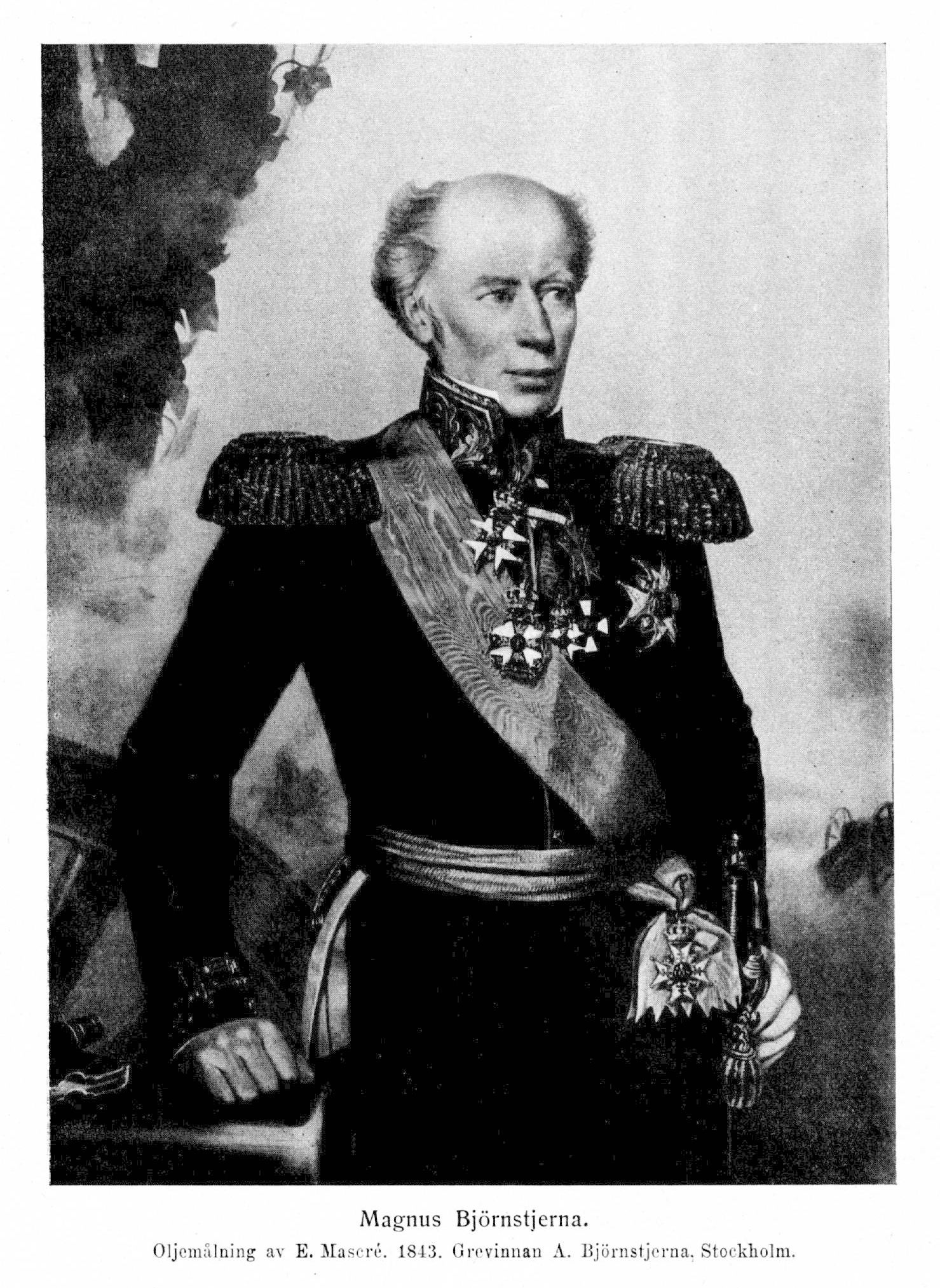 2. Magnus Fredrik Ferdinand Björnstjerna, f. 10 okt. 1779 i Dresden, d 6 okt. 1847 i Stockholm. Föräldrar: envoyén Magnus Olof Björnstjerna och baronessan Vilhelmina von Hagen. Fänrik vid livregementsbrigadens värvade infanteri (sedermera finska gardesregementet, slutligen andra livgardet) 28 okt. 1793; stabsfänrik 29 juli 1795; adjutant 30 maj 1796; löjtnant i regementet 26 okt. s. å.; premiärlöjtnant 15 nov. 1799; kommenderades med regementet till garnisonstjänst i Borgå; stabskapten 1 mars 1805; erhöll kaptens lön 15 dec. 1806; överadjutant vid finska arméns generalstab 1808; major i armén och överadjutant hos K. M:t 29 juli s. å.; tredje major vid Västmanlands regemente.19 dec. s. å.; sändes av riksföreståndaren med en hemlig beskickning till kejsar Napoleon 30 mars 1809; överstelöjtnant i armén 12 sept. s. å. med tur från 1 maj s. å.; placerades vid Kalmar regemente 20 mars 1810 och erhöll överstelöjtnantsbefattningen därstädes 7 aug. s. å.; militär ledamot i krigskollegiet 1 sept. 1811; chef för fältmarskalken H. H. von Essens generalstab s. å.; överste i armén 14 jan. 1812 med tur från 3 dec. 1811; generaladjutant och chef för fältmarskalken Kurt von Stedingks generalstab .1812; kommenderad i egenskap av generaladjutant vid västra kustförsvaret s. å.; generalmajor 19 jan. 1814 (konfirmationsfullmakt 1 mars s. å.); tjg. generaladjutant och chef för generalstaben 24 jan. 1815—10 apr. 1828; friherre 26 jan. 1815; ledamot av en 20 juni s. å. tillsatt kommitté, vilken avgav förslag till och ombesörjde uppförandet av ett mediko-kirurgiskt institut i Stockholm samt genom särskilt uppdrag 6 juni 1818 togs i anspråk jämväl för veterinärväsendets och veterinärundervisningens nyorganisation; ordförande i kommittén angående reglering av arméns läkarestat 22 okt. 1816—19 febr. 1817; ledamot av kommittén angående undervisningen på Karlberg 2 dec. 1818—10 maj 1819, av befästningskommittén 16 febr.—12 maj 1819 och av kommittén angående ett invalidhus (betänkande 17 dec. 1819); generallöjtnant 29 febr. 1820; ledamot av kommittén angående en förbättrad fångvård 3 nov. s. å.—5 mars 1823; artilleriinspektör 28 sept. 1821; ledamot av finanskommittén 3 maj 1822 (betänkande tryckt 1823) samt av kommittén angående stuteriet vid Strömsholm 2 mars 1824—25 maj 1825; greve 11 maj 1826; minister i London 12 jan. 1828–29 dec. 1846; en av rikets herrar 30 juni 1841; general 6 febr. 1843. LKrVA 1807; RSO 1808; RmstkS02kl 1814; KSO 1815; KmstkSO 1817; HedLKrVA s. å.; LVA 1835; RoKavKMO 1838; HedLÖS 1843; innehade dessutom flera hederstecken och utländska ordnar.