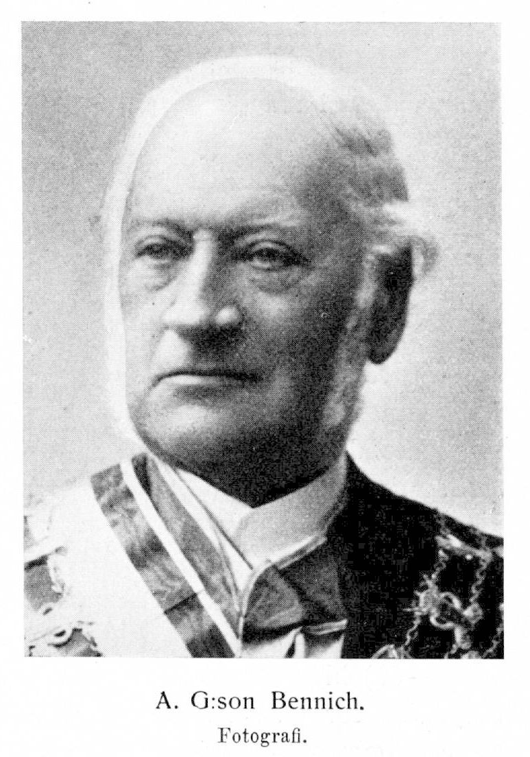 Bennich, Nils Axel Gustafsson, f. 31 okt. 1817 på Opphem i Tjärstads församling, d. 23 jan. 1904 i Stockholm. Föräldrar: majoren Gustav Bennich och Gustava Henrietta Sabelfelt. Elev via Linköpings skola 1828; student i Uppsala 13 okt. 1835; avlade examen till rättegångsverken 31 maj 1838., Auskultant vid Stockholms rådhus- och kämnärsrätter 15 juni 1838 och vid Svea hovrätt 22 juni s. å.; e. o. notarie vid hovrätten 1 okt. s. å.; v. notarie vid Stockholms rådhusrätt 22 juni s. å. och vid norra förstadens östra kämnärsrätt 15 aug. s. å.; förordnad att som domare biträda vid samma kämnärsrätt 1 nov. 1839; v. notarie i Svea hovrätt jan. 1840; kanslist hos rikets ständers bevillningsutskott från 1840, varvid han merendels förrättade notariatgöromålen; kopist i Svea hovrätt mars 1840–febr. 1846; förvaltade Ärlinghundra, Seminghundra, Långhundra och Färentuna härads domsaga 12 jan.–14 febr. 1844; tf. auditör vid andra livgardet under tre månader från 27 juni s. å.; förordnad att t. v. förestå krigsfiskalämbetet 18 dec. s. å.; sekreterare i kommittén för utarbetande av förslag till förbättrad lyshållning å Stockholms gator 25 maj 1845; notarie i krigshövrätten 13 juni s. å.; krigs-fiskal 23 jan. 1846; sekreterare i kommittén för utarbetande av förslag till ny. krigslag 13 febr. s. å. (bet. 1847); vald till sekreterare i bevillningsutskottet 28 juli 1848 och utövade sedan denna befattning t. o. m. riksdagen 1859–60; brottmålsnotarie i Stockholms kämnärsrätts tredje avdelning 28 jan. 1848 och i Stockholms rådhusrätts fjärde avdelning 31 dec. 1849; sekreterare i den enligt K. resolution 3 okt. 1855 tillsatta kommittén angående Sveriges och Norges ömsesidiga handel och sjöfart (slutbet. 2 maj 1856); notarie för uppbördsärenden i Stockholms handels- och ekonomikollegium 2 juni 1857; ledamot av Stockholms enskilda banks direktion 7 apr. 1858–31 mars 1860 och 2 apr. 1865–31 mars 1871; ledamot i finanskommittén 26 okt. 1858–9 febr. 1863; andre notarie i Stockholms handels- och ekonomikollegium 5 nov. 1858; landshövding i Jämtlands län 20 jan. 1860; ledamot i kommittén angående järnväg norrut från huvudstaden 7 mars–17 juni 1862; ordförande i tullkommittén 6 nov. 1863–22 juli 1865; adlad 3 maj 1864; generaltulldirektör 24 febr. 1865; deltog i riksdagen 1865–66; ledamot av riksdagens första kammare för Jämtlands län 1867–84 och för Kalmar läns norra landstingsområde 1885–93 och var därunder bl. a. ledamot i bevillningsutskottet 1867–86 (v. ordförande 1869–82 och ordförande 1883–86) samt i särskilt utskott 1892 urt.; ledamot av styrelsen för Stockholms handelsbank från 1871 (ordförande 1874—1900); ledamot i kommittén angående kommerskollegiets indragning 5 juni 1874–13 jan. 1875; stadsfullmäktig i Stockholm 1875–79 (v. ordförande 1877–79); ordförande i tullkommittén 29 sept. 1876–18 febr. 1882, i styrelsen för Stockholm—Västerås—Bergslagernas trafikab. (Nya järnvägsab.) 1880–maj 1899, i kommittén angående kreditupplag och frilager 27 okt. 1882–aug. 1885 och i kommittén angående differentialtullar 18 aug.–15 dec. 1886; erhöll avsked från generaltulldirektörsbefattningen 28 sept. 1888; ledamot av styrelsen för nya amorteringsfonden för apoteksprivilegier 10 febr. 1893. RNO 1860; KNO 1863 (1 kl 1873); hedersledamot av Cobden club 1872; KmstkNO 1875; LLA 1880; LMA 1882; KmstkVO 1886; innehade dessutom flera utländska ordnar.