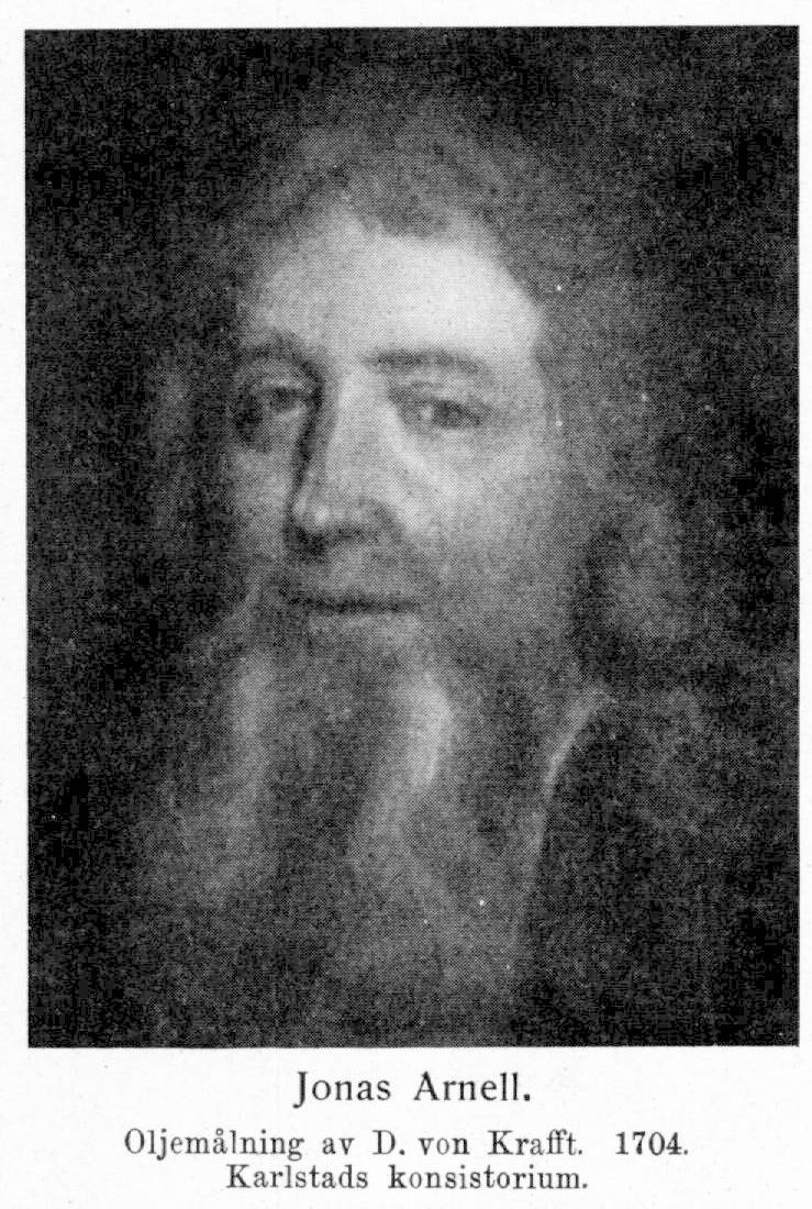 1. Jonas Arnell, f. 29 juni 1642 i Hudiksvall, d 12 nov. 1707 i Karlstad. Föräldrar: handlanden och rådmannen Lars Jonsson och Karin Eriksdotter (av Tresk-släkten). Efter åtta års studier i Hudiksvalls skola student i Uppsala 16 okt. 1658; informator för J. Schefferus' söner Johan, Henrik och Peter 1662–67, för G. Posses söner Knut och Leonard 1667–77 samt tillika från 1671 för Axel Sparre; disp. 23 juni 1671 (De re annonaria, pres. J. Schefferus) och 3 dec. 1672 (De duellis, pres. K. Arrhenius); fil. magister 12 dec. 1672; företog tillsammans med sina disciplar Axel Sparre och Leonard Posse studieresor till Holland, England, Frankrike, Tyskland och Danmark 1677–80; återtog efter hemkomsten undervisningen för bröderna Knut och Leonard Posse samt Axel Sparre. Valdes efter predikan i Maria kyrka nästan enhälligt till kyrkoherde i Maria Magdalena församling i Stockholm 2 juni 1681 (ej 1682, som protokollet s. 61 med uppenbar felskrivning anger); erhöll K. fullmakt 5 juli s. å.; tog säte såsom assessor i Stockholms stads konsistorium 22 febr. 1682; superintendent i Karlstad 16 dec. 1704; tillträdde i maj 1706.