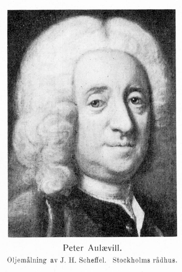 Aulævill, Peter, f. 28 sept. 1677 i Stockholm, d 14 dec. 1757. Föräldrar: handelsborgmästaren i Stockholm Axel Aulævill och Anna Henriksdotter Karckman. Student i Uppsala 19 nov. 1687; disp. 16 dec. 1699 (Adumbratio quzedam juris naturalis et civilis eorumque qualiscunque collatio, pres. C. Lundius); auskultant i Svea hovrätt 9 febr. 1701; stadsaktuarie i Stockholm 18 apr. s. å,: stadsnotarie 12 maj 1703; e. jo. rådman 8 febr. 1712; rådman 2 maj s. å.; ledamot av kommissionen angående flyttningsmedlen 9 juli s. å., av lagkommissionen 11 juni 1714 samt av ecklesiastikdeputationen 17 okt. 1723; preses i södra kämnärsrätten 22 dec. 1721; riksdagsman i borgarståndet 1726–27, 1734–47; medlem av slottsbyggnadsdeputationen 4 aug. 1727 samt av kommissionen för amiralitetet och försvarsverket s. d. (K. konstitutorium 30 aug.); bankofullmäktig 1728–42; justitieborgmästare 4 dec. 1731. RNO 1751.