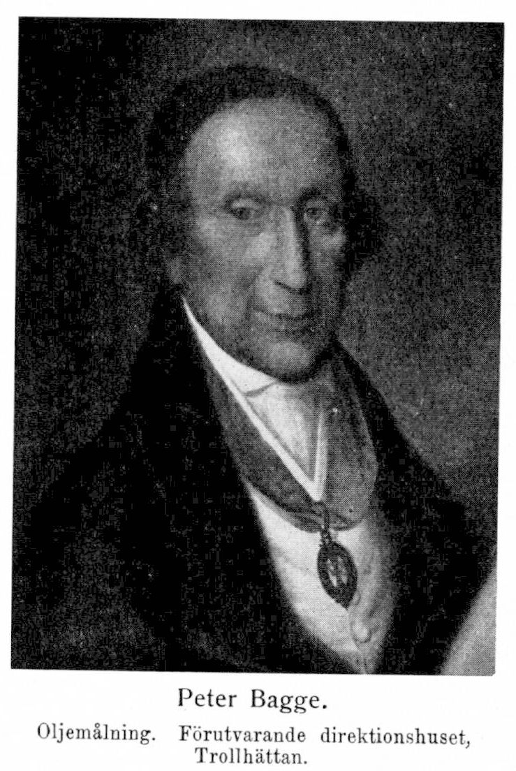 2. Peter Bagge, f. 10 aug. 1743 i Göteborg, d 13 juni 1819 i Uddevalla. Föräldrar: handlanden i Göteborg Peter Samuelsson Bagge och Anna Kristina Busck. Studerade under ledning av informatorer, bl. a. i Lund fr. 1757 (inskrevs i Göteborgs nation 9 maj 1759); arbetade vid skeppsvarvet Viken 1759 och 1760 samt vid den av fadern arrenderade kungsgården Ås[1] kloster från 1760; reste utrikes 1763–64; handlande och fabrikör; erhöll burskap i Göteborg 1767; jordbrukare från 1778 och snart tillika bruksidkare; ledamot i den kommitté, som hade till uppgift att granska de inkomna förslagen till Trollhätte kanals fullbordan, 7 nov. 1793 ; en av de sex direktörer, som skulle handhava aktieteckningen och kanalbolagets bildande 13 dec. s. å.; medlem i direktionen av Trollhätte kanal- och slussverks bolag 1794–1800. Ledamot av patriotiska sällskapet 1788; RVO 1801.