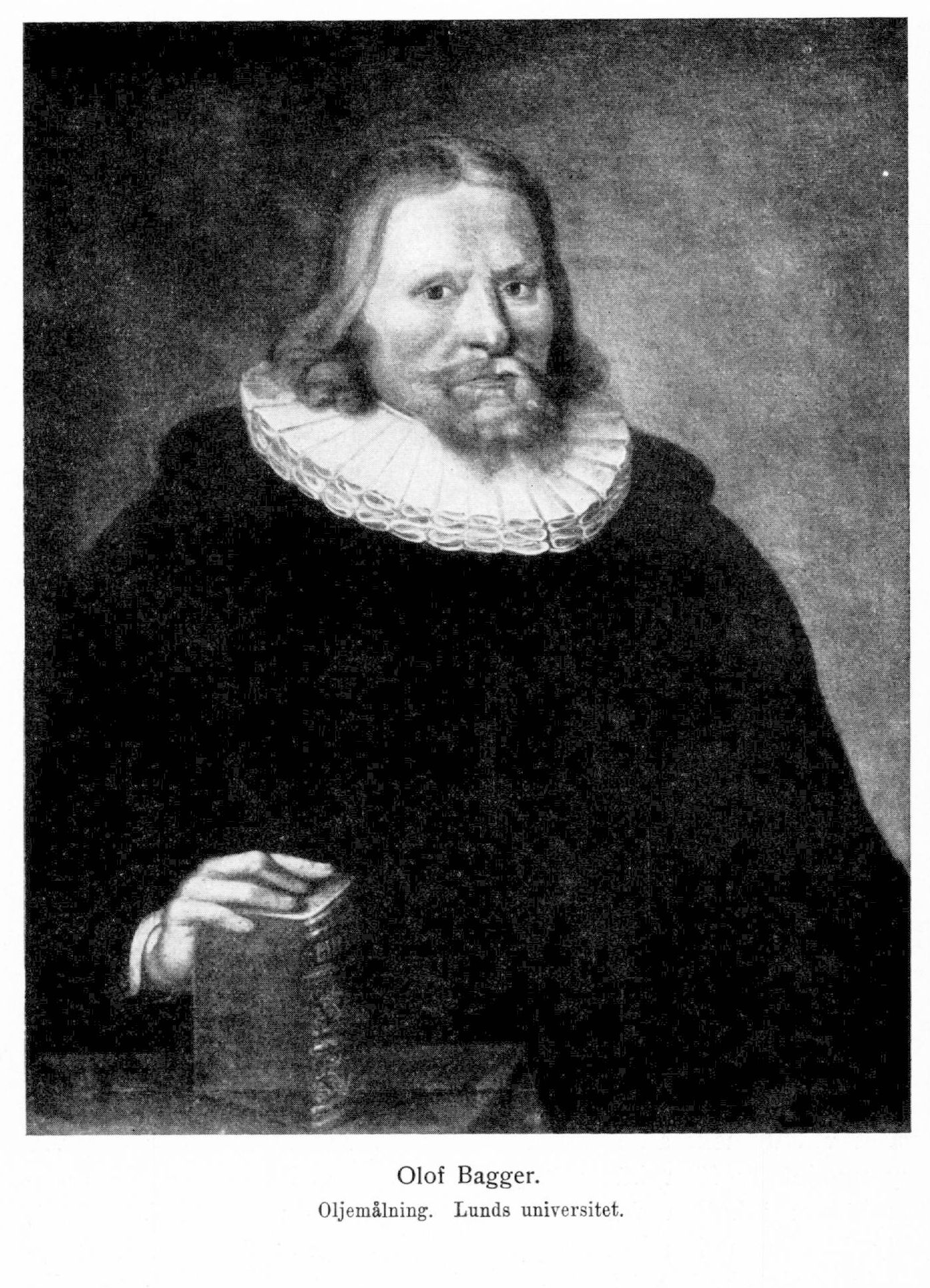 1. Olof Johannsen Bagger, f. 10 mars 1607 i Odense på Fyen, d 11 mars 1677 i Lund. Föräldrar: rådmannen Johann Borchardsen och Karen Nielsdatter Bagger. Immatrikulerad vid Köpenhamns universitet 23 mars 1626 under namn av Olaus Johannis Otthoniensis; baccalaureus därstädes 19 maj 1628, då han skrev sig Baggerus; magister därsammastädes 12 maj 1635; företog en sexårig studieresa genom Tyskland, Frankrike, Holland och England. Sökte hösten 1636 förgäves ett ledigt professorsämbete vid Odense gymnasium; sysselsatt med privatundervisning i Köpenhamn 1636–38, varvid hans berömdaste lärjunge var sedermera biskopen i Själlands stift Hans Wandal; rector scholae i Lund febr. 1638; tillika kyrkoherde i Fjälie (prebende) 1640; teol. lektor och professor vid gymnasiet i Lund samt kyrkoherde i Stångby och Vallkärra prebendeförsamlingar 1650; prost i Torna, härad s. å.; ex officio ledamot av Lunds domkapitel; dess generalprokurator 1656; innehade tillika andra därunder sorterande ämbeten och namnes sålunda i 1656 års förteckning över »deputati ad officia» notarius causarum matrimonialium, procurator civitatum Malmogiensis et Lundensis, procurator coemeterii och sacristanus; var även notarius synodi och vid 1664 års riksdag en av stiftets representanter; vid gymnasiets upplösning och universitetets inrättande överflyttad på det sistnämndas stat med bibehållande av prebendet och utnämnd till theologiae professor secundus 29 nov. 1667; universitetets förste rektor, intill 15 juni 1668; theologiae professor primarius s. å.; ånyo rektor 20 dec. 1675–25 juni 1676.