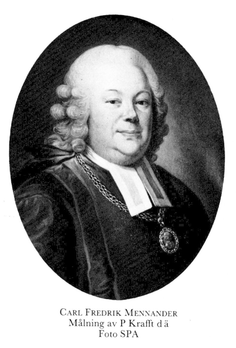 1 Mennander, Carl Fredrik, f 19 juli 1712 i Sthlm (Schönfelts gen, RHA), d 22 maj 1786 i Uppsala, Domk. Föräldrar: kh o prosten Andreas M o Margareta Elisabet Ruuth. Utex från Vasa trivialskola 22 juli 26, inskr vid Åbo akad 4 okt 26, vid UU 13 okt 32, disp pro gradu vid Åbo akad 25 juni 35, mag där 11 juli 35, fil adjunkt 7 juli 38, prof i fysik där o kh i Piikkis, Åbo o Björneb, 2 okt 46, prästv i Sthlm 14 okt 46, kh i S:ta Marie förs, Åbo o Björneb, 48–57, inspektor för Österbottniska nationen vid Åbo akad 10 maj 50–57, TD vid UU 15 juni 52, fjärde teol prof vid Åbo akad 11 dec 52, akad:s rektor 53–54, tredje teol prof där 54, deltog i riksdagarna 55/56, 60/ 62, 65/66, 69/70, 71/72 o 78/79 (talman 78/ 79), biskop i Åbo 10 febr 57, kh i Sagu, Åbo o Björneb, 58–75, led av bibelkommissionen 18 maj 73, ärkebiskop i Uppsala från 31 aug 75. – LVA 44, LVVS 77, HedLVS 77.