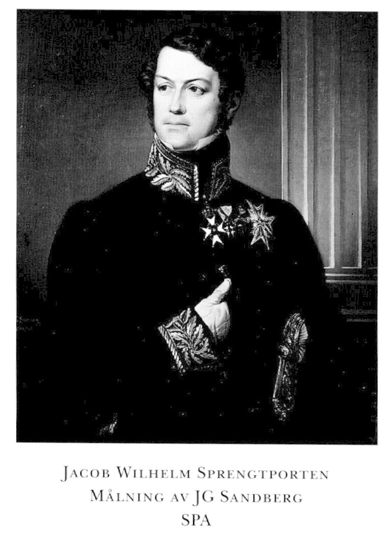 3 Sprengtporten, Jacob Wilhelm, brorson till S 1 och S 2, f 9 okt 1794 i Hyltinge, Söd, d 29 sept 1875 där. Föräldrar: ambassadören o generalen, frih Johan Wilhelm S (s 62) o grev Sophia Lovisa Mörner. Inskr vid UU 29 sept 09, ex till rättegångsverken där 30 maj 11, auskultant i Svea hovrätt 21 juni 11, kornett vid Livg till häst 4 febr 12, ofh-cersex maj 12, deltog i fälttågen i Tyskland o Norge 13-14, löjtn vid Livg till häst 22 maj 14, adjutant o attaché hos greve C A Löwenhielm (bd 24) i S:t Petersburg sept 16-maj 17, stabsryttmästare vid Livg till häst 3 febr 18, ryttmästare 12 maj 22, major där 6 maj 23, deltog i riksdagarna 23-65/66 (led av allm besvärs- o ekonomi-utsk 28/30, av statsutsk 40/41), överste-löjtn i armén 1 dec 24, överstekammarjun-kare 26 juni 25, överhovjägmästare 4 juli 27-15 maj 38, ordf i komm ang skogs-hushållmen o jaktväsendet mars-nov 28, överste i armén 21 april 28, chef för Skogs-inst 15 okt 28-25 maj 38, led av komm ang tullen på spannmål okt 29-jan 30, avsked från reg o generaladjutant i generalstaben 22 april 30, överståth i Sthlm 7 okt 30-30 juni 38 o 28 dec 44-26 juni 48, ordf i Sv jägarförb 30-39 o 45-46, ordf i komm ang åtgärder mot kolerans inbrott juni-juli 31, ordf i Sv trädgårdsfören 22 okt 32, led av Nord fornskriftsällsk 7 nov 33, generalmajor i armén 28 jan 34, led av Sv fornskriftsällsk 31 mars 45, ordf i komm ang socken-stämmoförordn för Sthlms stad okt 45-okt 46, i dir för Sv slöjdfören 45-48, led av be-skickn till Khvn juni 48, generalmönster-herre 24 april 56, led av beskickn till Paris 31 jan 58, generallöjtn i armén 23 mars 58-17 nov 63, led av Södermanlands läns landsting 63-70 o 72-74, ordf i komm för uppresande av Carl XII:s staty i Sthlm 66-68, led av FK 67-74 (led av tillf utsk 68 o 73, ålderspresident 67-74). - LKrVA 27, HedLKrVA 34, HedLLA 37, HedLFrKA 45, LYA 48, serafimerriddare 28 april 49, led av ett flertal uti lärda sällsk.