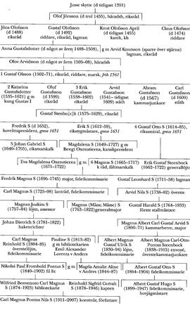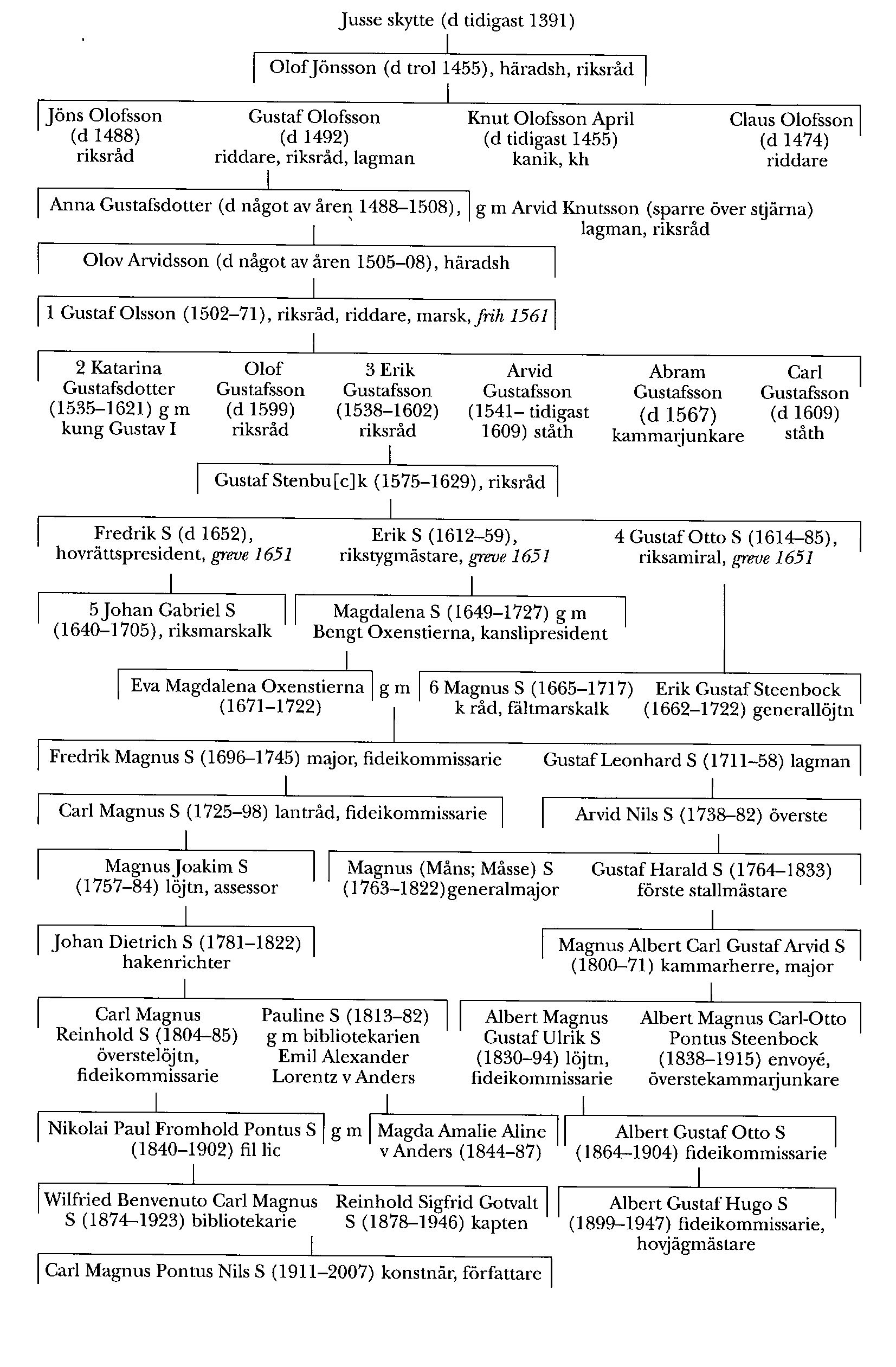 Med G utdog den äldre ätten S på manssidan. Han efterlämnade emellertid från sitt första äktenskap en dotter, Anna Gustafsdotter (d senast 1508), som i sitt andra äktenskap gifte sig med riksrådet och lagmannen i Tiohärad Arvid Knutsson (sparre över stjärna). Deras son Olof Arvidsson (d något av åren 1505-08) anses ha upptagit sitt mödernevapen stenbocken. Han hade som sätesgård efter sin far Torpa i Länghems sn i Västergötland och var 1503 häradshövding i Kind efter denne. Enligt brev från 1505 och 1508 (Sjödin) erlades mansbot efter två personer som O dödat.