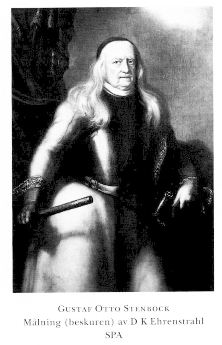 4 Stenbock, Gustaf Otto, sonson till S 3, f 7 sept 1614 i Länghem, V Götaland (Isogæus, s 617), d 24 sept 1685 i Sthlm (ibid, s 639; begr 30 april 1686 där, Ridd). Föräldrar: riksrådet frih Gustaf S o grev Beata Margareta Brahe. Hovjunkare 27, ryttare vid Smålands kavallerireg 31, kornett där 32, fänrik vid Scheratins tyska reg 33, kompanichef vid Hastfers tyska reg senast 12 juni 35, major där sept 36, överstelöjtn vid Kronobergs reg 36, överste för reg 28 april 37, generalmajor av infanteriet 31 juli 43, överkommendant i Minden 44, deltog i riksdagarna 44, 50 o 52, överkommendant i Westfalen 28 aug 45, generallöjtn av infanteriet löjan 47, general av infanteriet 30 mars 48, greve 27 mars 51 (introd 52), guvernör i Riga 31 maj 52-54, riksråd senast 18 nov 52 (ed 24 dec 52), krigsråd 18 jan 53, lagman över Ingermanland 4 juni 53-60, rikstygmästare 14 april 55-4 mars 57, fältmarskalk 28 juni 56, generalguvernör över Skåne, Halland o Blekinge 17 mars 58-64, lagman över Norrlands lagsaga 60-80, riksamiral (från 82 översteamiral) från 8 juni 64, LU:s kansler 19 dec 66-84, k råd från 28 febr 82.