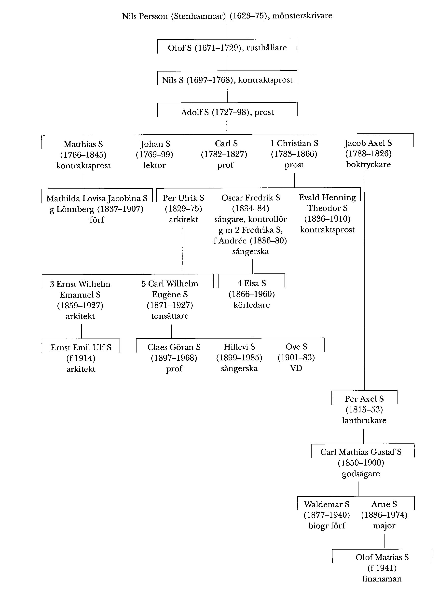 Adolf S:s yngste son Jacob Axel S (1788–1826) inskrevs vid UU 1806 och inköpte 1810 tillsammans med Vilhelm Fredrik Palmblad (bd 28) det akademiska tryckeriet. Han var litterärt begåvad och upptogs i det av P D A Atterbom (bd 2) initierade Auroraförbundet. Vid Palmblads sida var han utgivare av Upsala tidning och Elegant-tidning; dikter av hans hand infördes där. Axel S utträdde 1815 ur firma Stenhammar & Palmblad, som även innefattade bokhandel och förlagsrörelse, för att etablera sig som fabrikör vid Cedersholms lilla pappersbruk i Gärdserum, Kalm. Denna verksamhet var dock olönsam varför S 1817 slog in på prästbanan. Vid sin tidiga död, han drunknade i Göta kanal, var S vice pastor i Vreta klosters församling. En sonsonsson till honom var Waldemar S (1877–1940) som gjorde officerskarriär vid Andra livgrenadjärregementet där han erhöll majors avsked 1927. Från detta år tjänstgjorde han som registrator i Försvarsdepartementet. Han har i en serie arbeten (1918–41) tecknat Andra livgrenadjärregementets historia.