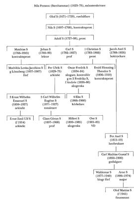 En yngre bror till Carl S var prästen och naturforskaren Christian S (S 1), från vilken många kända medlemmar av släkten härstammar. Son till honom, i hans andra gifte, var Per Ulrik S (1829–75). Han var efter studier vid Teknologiska institutet och FrKA:s byggnadsskola verksam som konsulterande arkitekt med inriktning på kyrkor och institutionsbyggnader. Han var också konduktör vid Överintendentsämbetet, senare e o arkitekt där, samt från 1866 agré och lärare vid FrKA. Inom Överintendentsämbetet utarbetade S på 1860-talet "normalritningar" för folkskole- och seminariebyggnader. Det var den första normering som gjordes av byggnadsverksamheten på detta område och den fick ett betydande genomslag. S ritade också ett flertal större byggnader, som lasarettet i Västerås (1867), läroverket i Vänersborg (1869), i nyrenässansdräkt, och Sabbatsbergs fattighus i Sthlm (1872). Fast engagerad arkitekt hos Serafimerordensgillet från 1874 var han vid sin tidiga bortgång följande år på väg att inta en ställning som specialist på vårdbyggnader, en position som övertogs av Axel Kumlien (bd 21). S var starkt religiöst intresserad och drivande kraft vid tillkomsten av det åttkantiga kapellet vid Ersta diakonissanstalt i Sthlm (1871–72). Själv medlem av Sv diakoniss-sällskapet föreslog han platsen för bygget och överlämnade ritningarna till det.