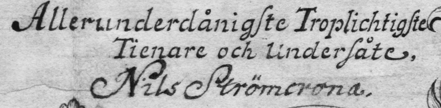 Strömcrona (före adl Ström), Nils, f 1664 i Marstrand, d 21, begr 30, jan 1740 i Karlskrona, Amiralitetsförs. Föräldrar: rådmannen Tormo Nielsen Ström o Margareta Matsdotter. Inskr vid univ i Khvn 82, vid LU 24 april 86, kurator vid Gbgs nation där 91–92, konduktör vid Styrmansskolan i Karlskrona 91 (tilltr 92), underlöjtn vid Amiralitetet 91, överlöjtn där 18 juli 96, styrmanskapten o lotsdir från 9 juli 97, kommenderad på flottan mot Danmark 00 o 11--12, kommendör 7 okt 17, adl 4 aug 27 (introd 27).